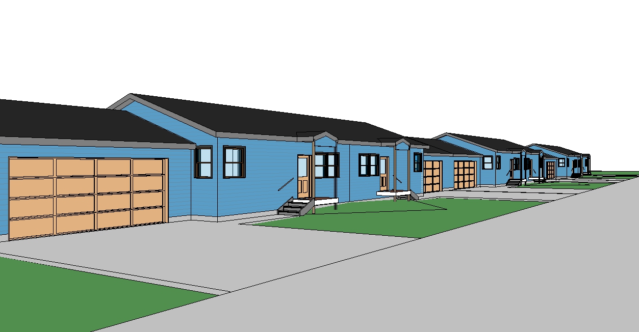 prairie style exterior shot add some trees behind the houses make the concrete in the lower right side of the image look more like a street add a car in one of the driveways architecture