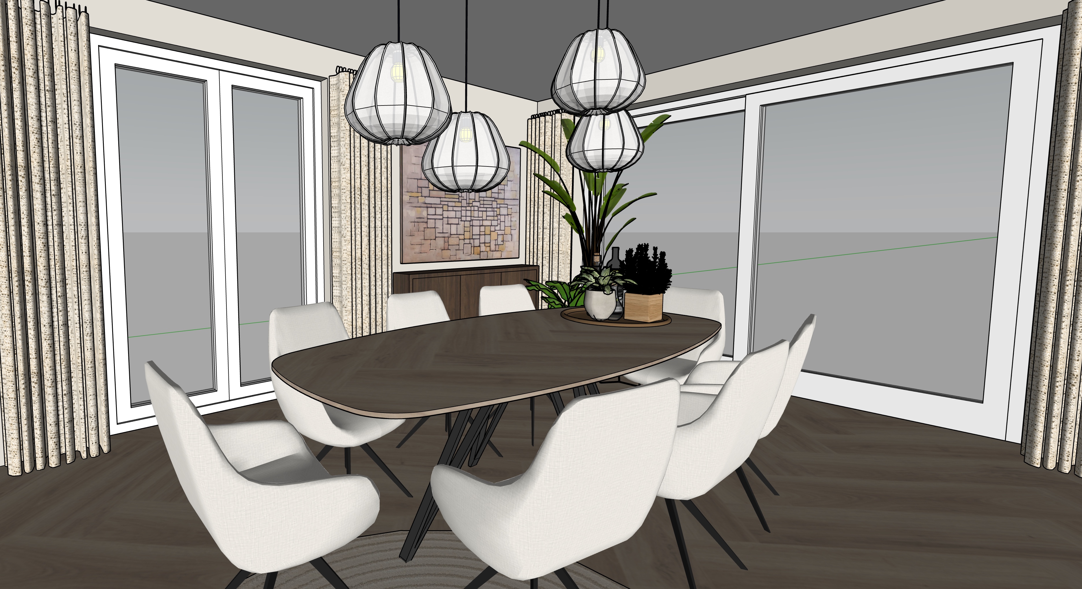 render of 3d model lights above the table turned on and natural light coming trough the windows on the left and the right an overal light image trough the combination of natural light and the lamps
