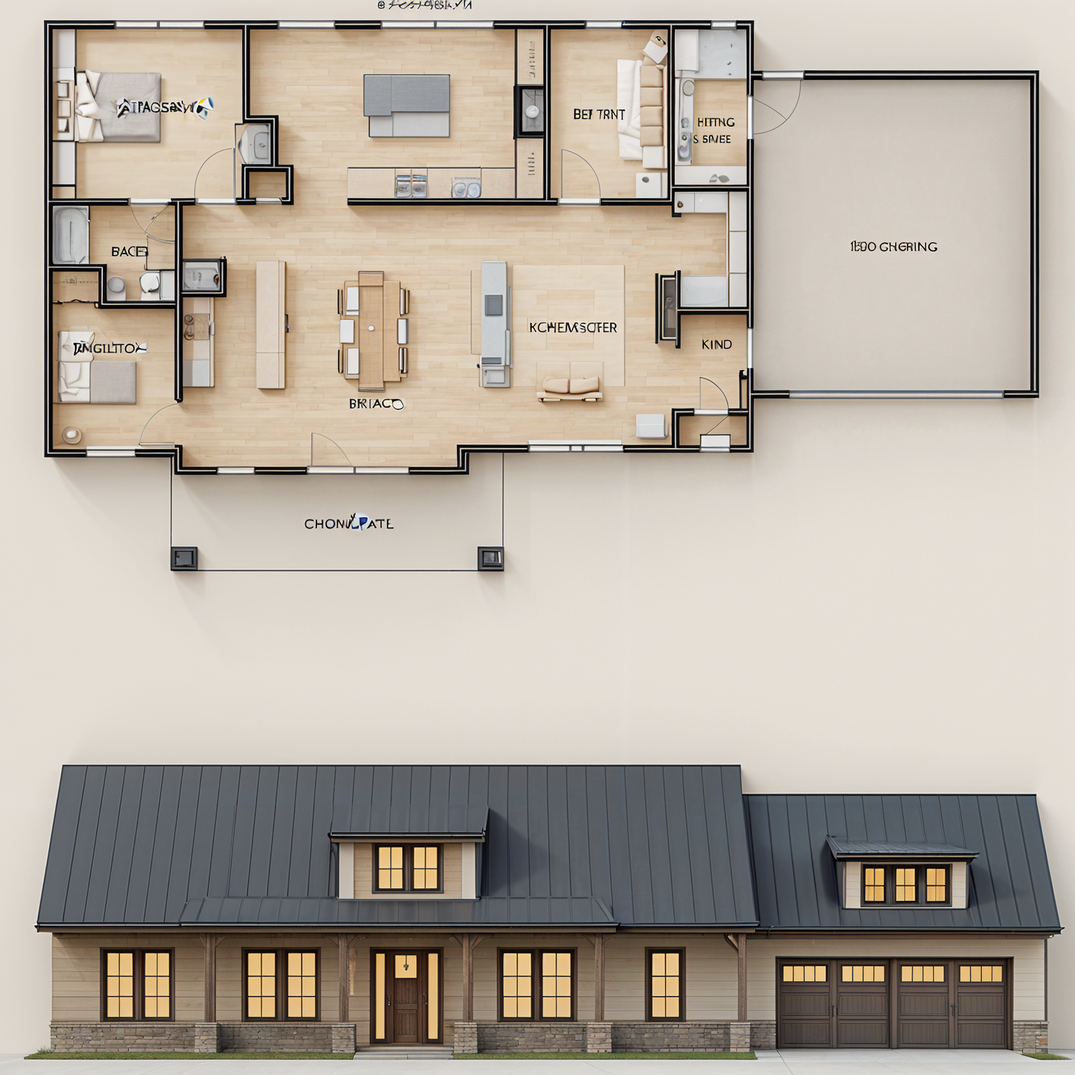 render a modern exterior with brick around garage opening with slatted panels on from and vertical vinyl on the side walkway wall do not change any structural elements remove the chain link fence in the front and include a fence on the walkway to the front door architecture