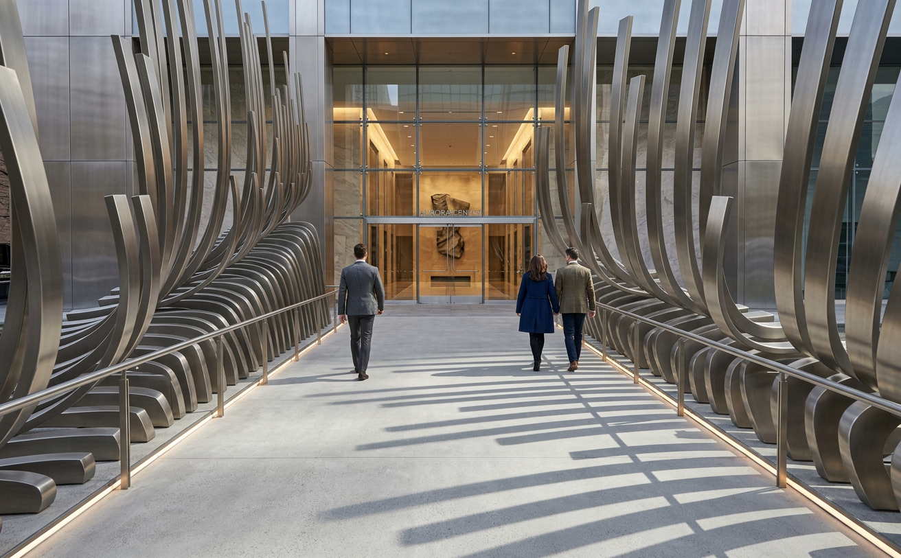render it to be a threshold to a building but make sure the shadow stays the same make the building behind the threshold add people in it as well do not change the model keep the beams the same make sure its flat not going up