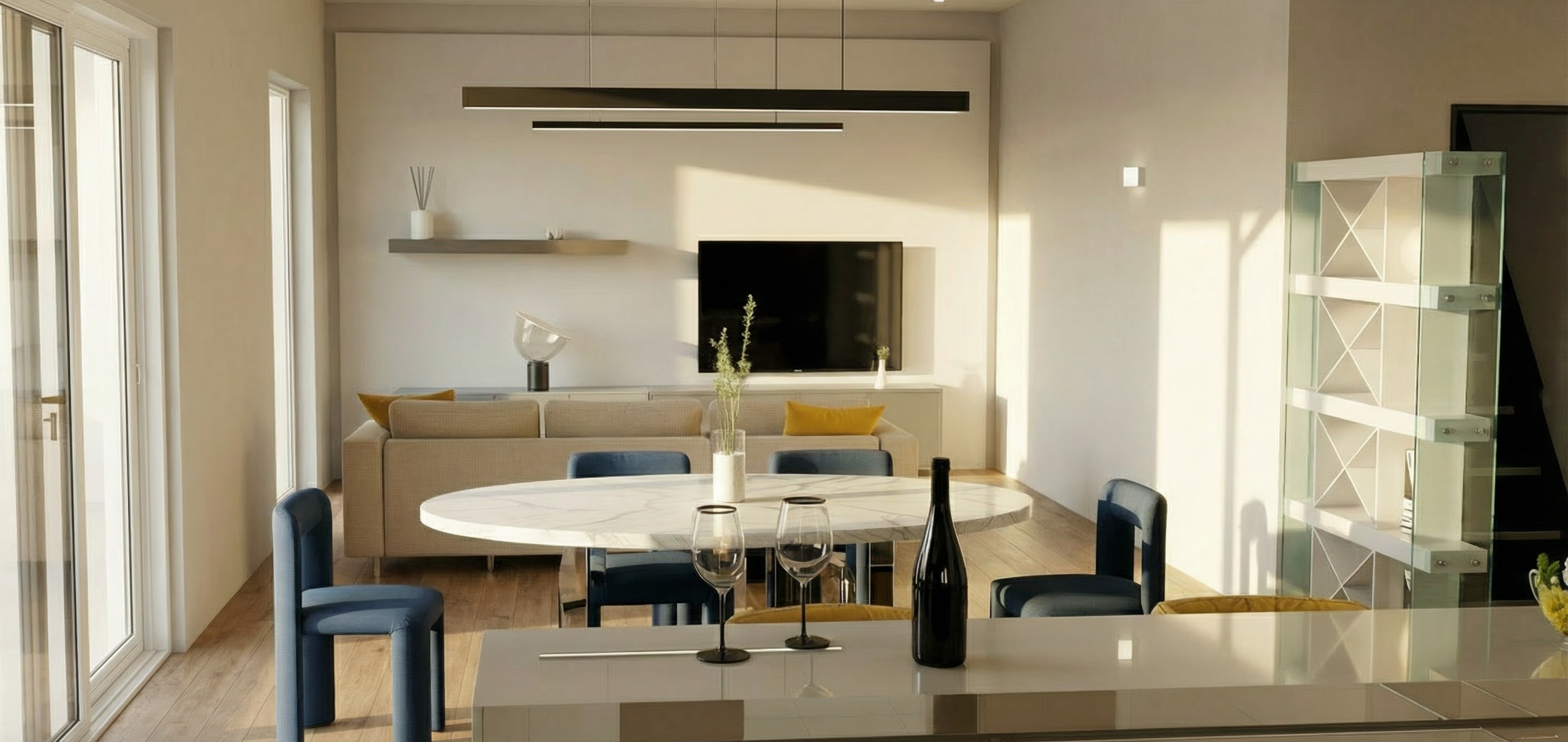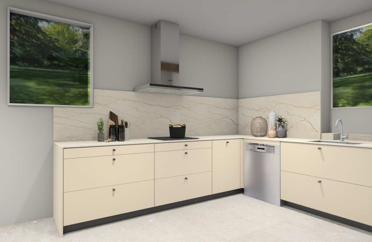 modern kitchen space with matte cream door cupboards and marble splashback sun comes in from the two windows in a bright summer morning with views to the private garden