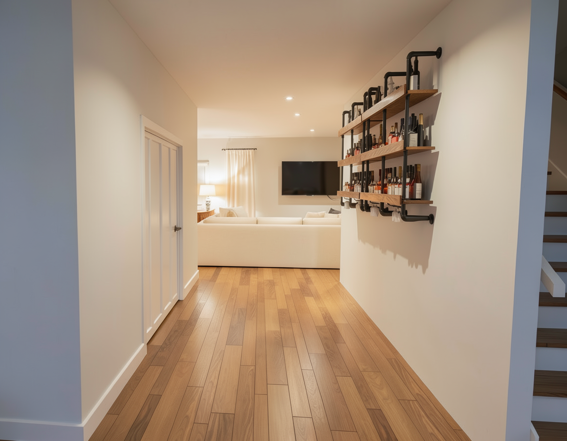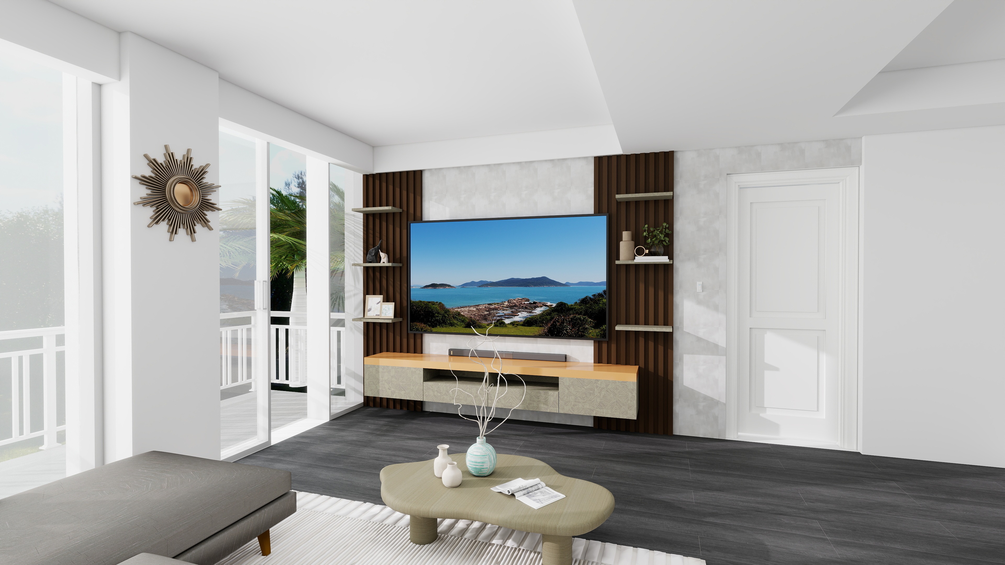 render a modern interior living room design featuring a large 65 tv mounted on a wall with a white oak back panel surround the tv with dark brown fluted panels and light brown shelves include a sleek light brown cabinet below the tv with a warm yellow stone top like granite to the side integrate tall shelving units featuring ambient led lights in each section use soft natural lighting to create a cozy and inviting atmosphere the overall color palette should include white oak dark brown light brown and warm yellow tones creating a harmonious and elegant space needs to look more reaistic