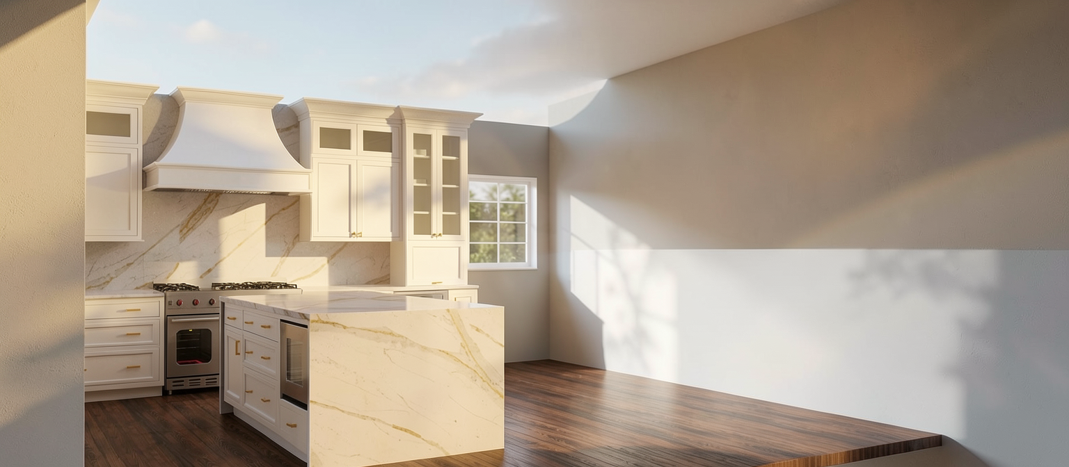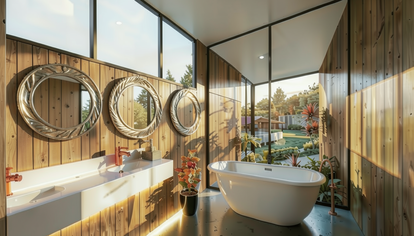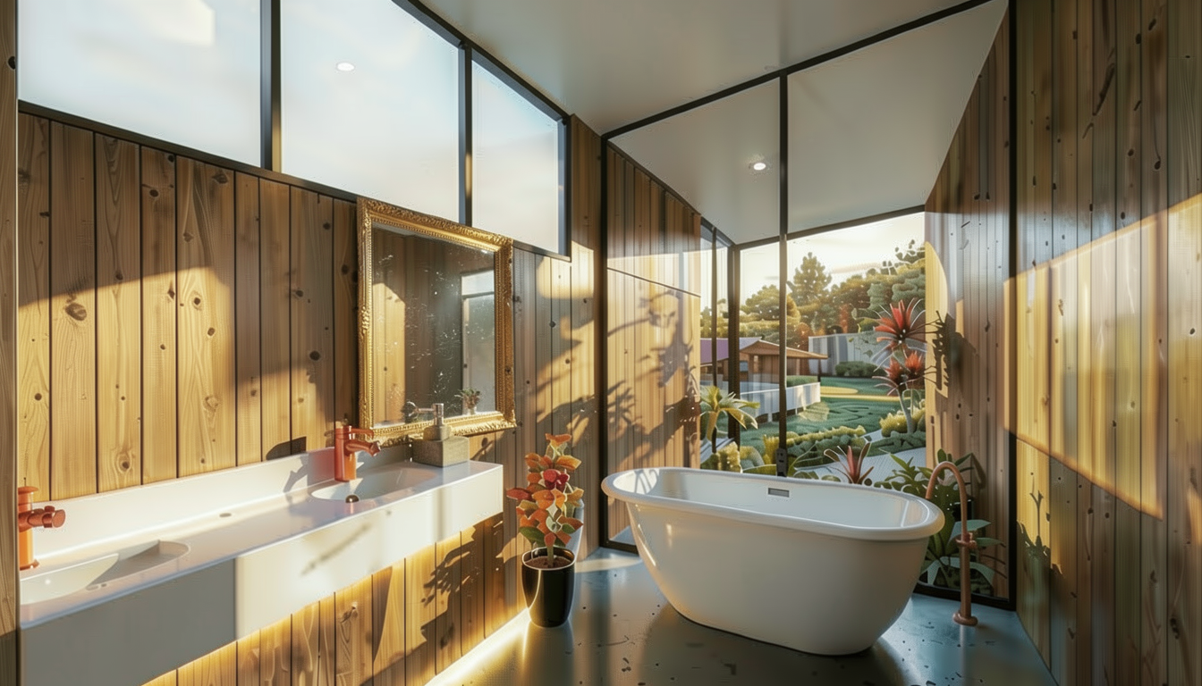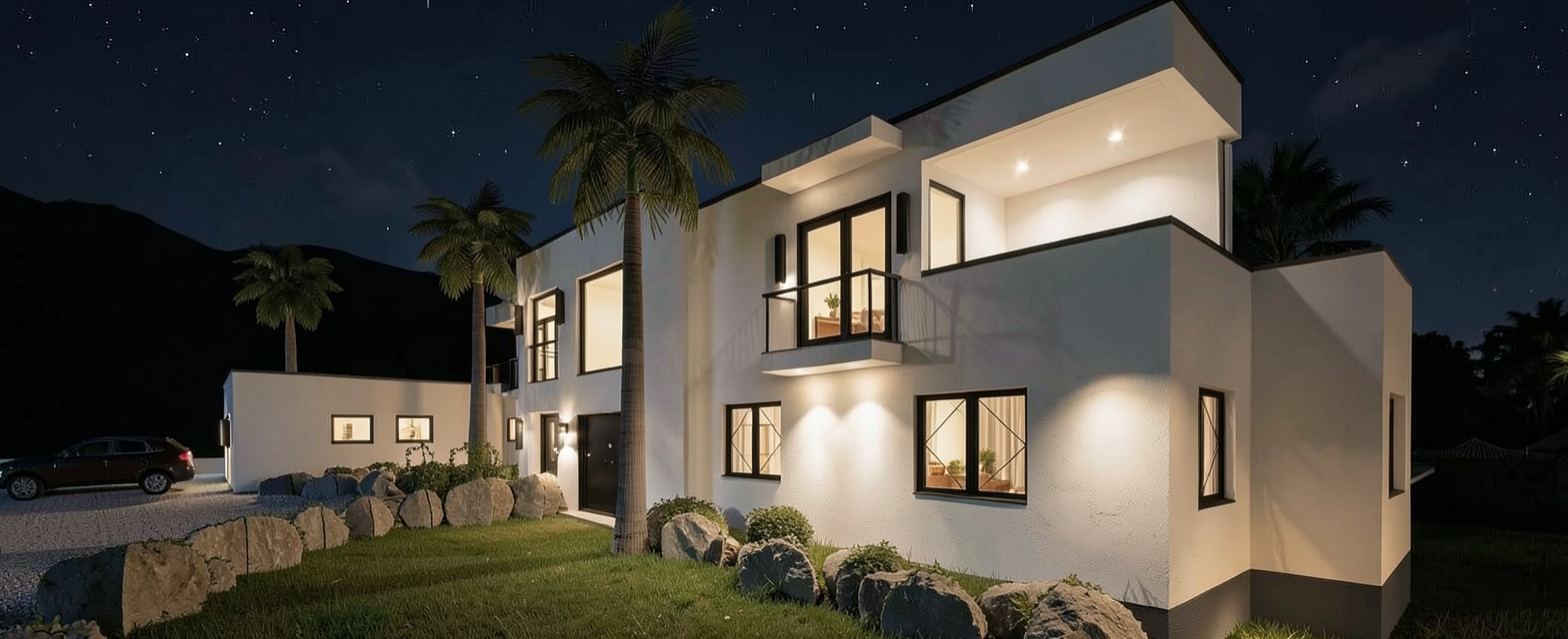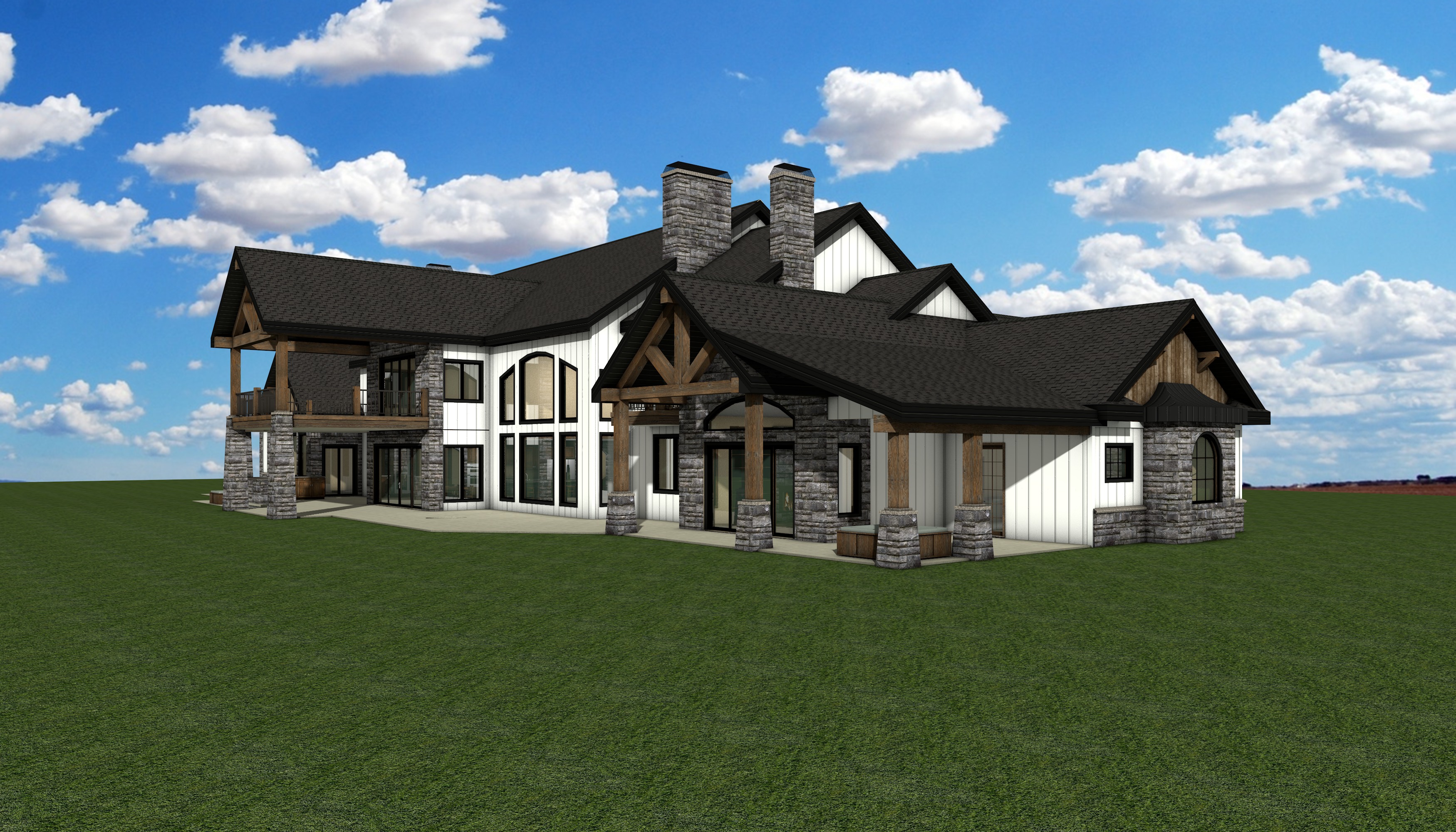 a modern house retain the exact structure colors and window arrangement rooflines siding roof material foundation height railings wood stain colors and proportions exactly as shown in the reference image integrate into the terrain horizon is at a lower flat angle with some sagebrush in the distance with sand hills and dunes behind the sagebrush there are some smaller mountains behind the sand hills mostly in the distance of the image add cooler diffused sunlight subtle dappled highlights across the siding and grass create ultra photo realistic lighting crisp shadows detailed textures in the siding and glass reflections and an overcast sky show only a few lights visible inside render in hyper photo realistic architectural visualization quality 8k resolution make it the fall season add realistic landscaping around the home no sagebrush in the foreground grass in the foreground no trees in the background of the image