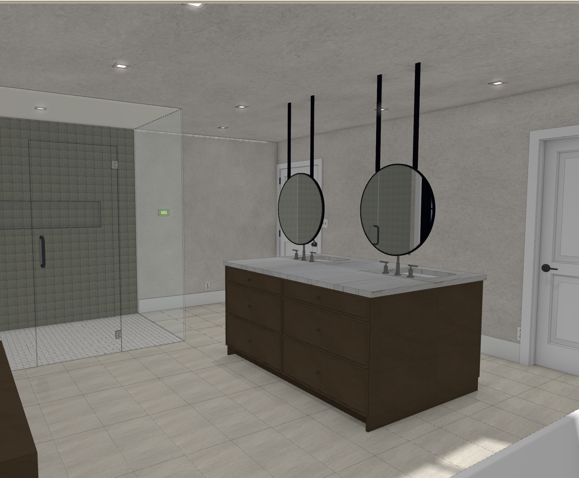 render a luxurious modern bathroom with a serene and elegant ambiance the walls should be in a subtle calming grieve plaster the floor is tiled with light cream tiles for a clean airy feel with texture the wooden vanity is a red oak wood in raw umber stain offering a touch of sophistication featuring a sea pearled quartzite the mirrors are round and frameless adding a sleek modern touch the glass shower partition should be clear highlighting the contemporary matte black fixtures within soft ambient lighting from recessed ceiling lights enhances the tranquil environment overall aim for a balance of warmth and modern minimalism with an emphasis on subtle elegance and clean lines