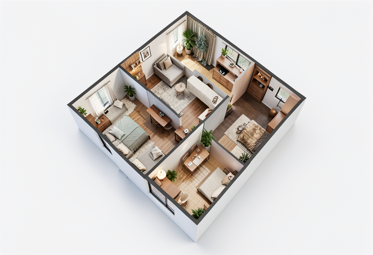 alvar aalto exterior shot a conceptual architectural plan rendering of a modern two story house floor plan the ground floor displays a luxurious outdoor pool area with vibrant blue water surrounded by smooth light grey tiles inside the living area features warm earth toned wooden floors and sleek white modern furniture the dining area has a minimalist glass table with elegant chairs resting under soft pendant lighting the kitchen is equipped with stainless steel appliances and white cabinetry creating a clean and sophisticated look the top floor showcases three cozy bedrooms with plush beige carpets and soothing pastel walls the ambiance is serene and inviting bathed in natural sunlight streaming through large windows with lush green plants strategically placed for a touch of nature architecture