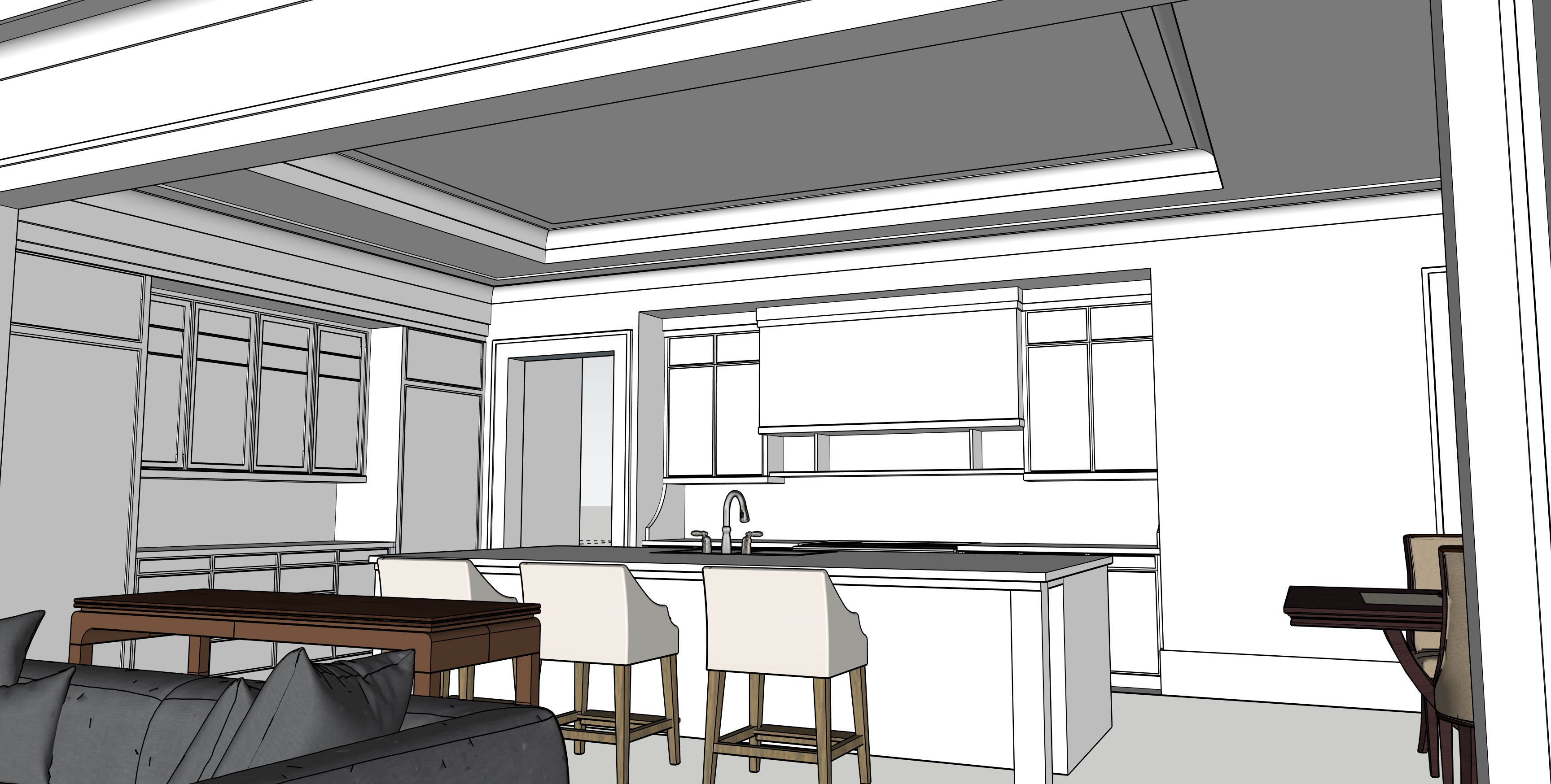 soft off white tones for walls and ceilings medium brown wood floors great lighting kitchen cabinetry to be slightly darker than wall color island to be slightly darker tone than kitchen cabinets doors leading to outside to be clear view glass and door frame color to match trim color add accessories to kitchen counter surface and coffee table elegant and crisp detailing add artwork to larger open wall areas great lighting kitchen island and counters to be lighter colored marble run marble from counter surface to underside of cabinetry