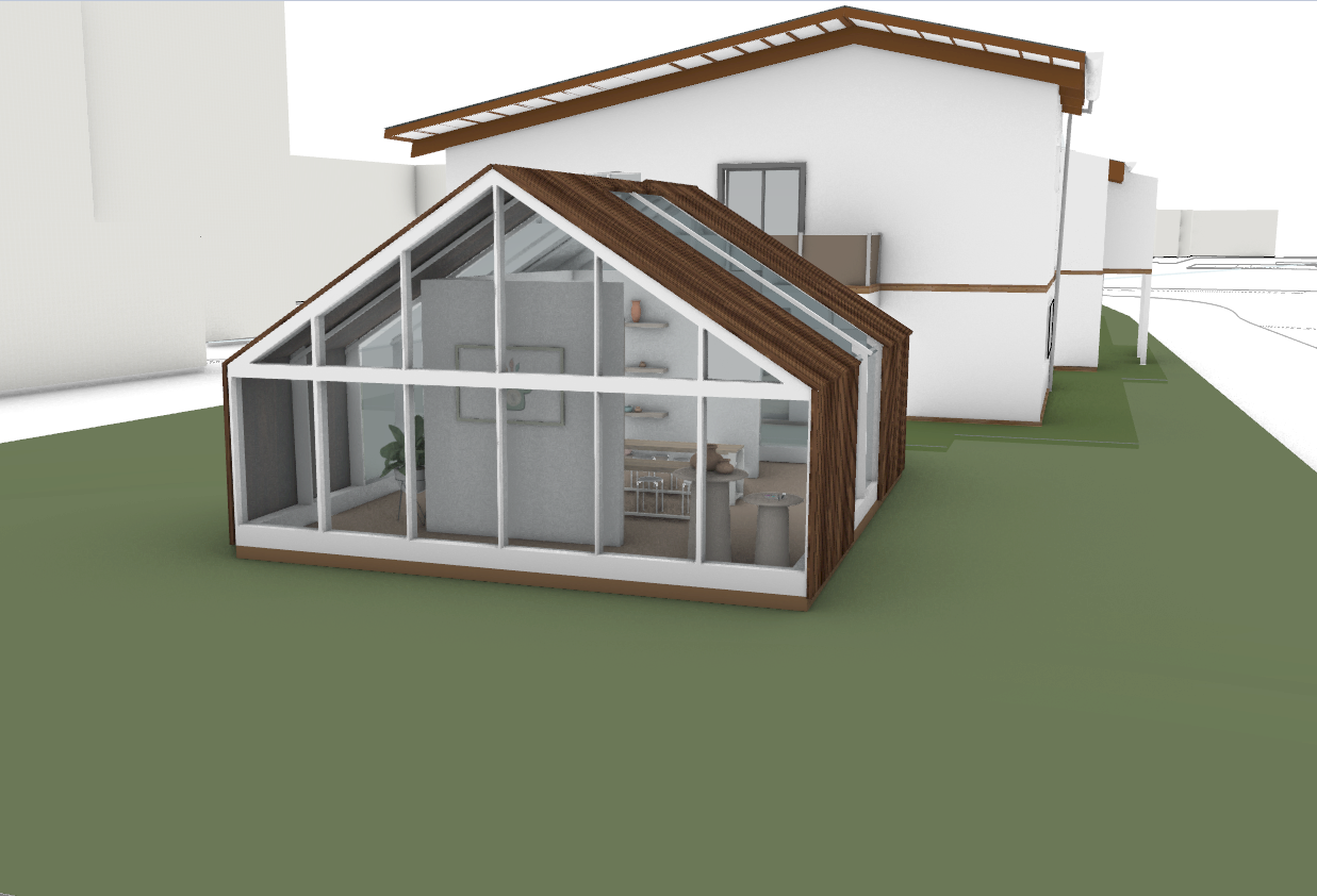 add trees to the green spaces add some people and some chairs and tables for people
