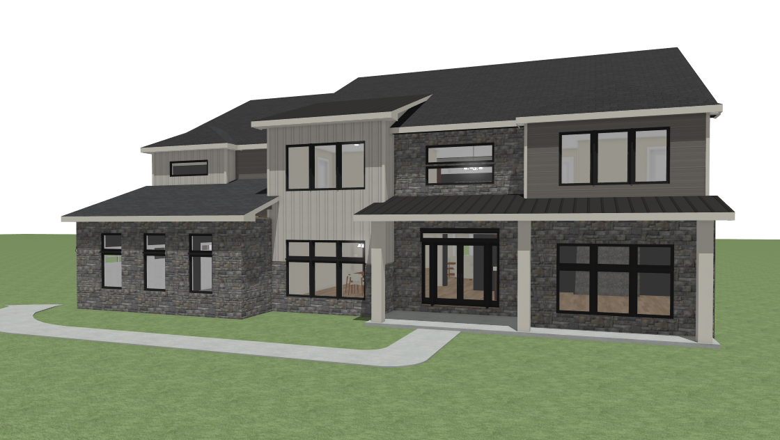 render this 3d image to appear photo realistic maintain all existing architectural materials and structural elements exactly as shown enhance the setting with a lush well maintained landscape include minimal beds manicured shrubs and a tree lined backdrop that frames the home naturally the windows should have a glossy finish with clear reflections of the surrounding trees and sky lighting should feel natural with soft shadows and realistic depth to bring the scene to life