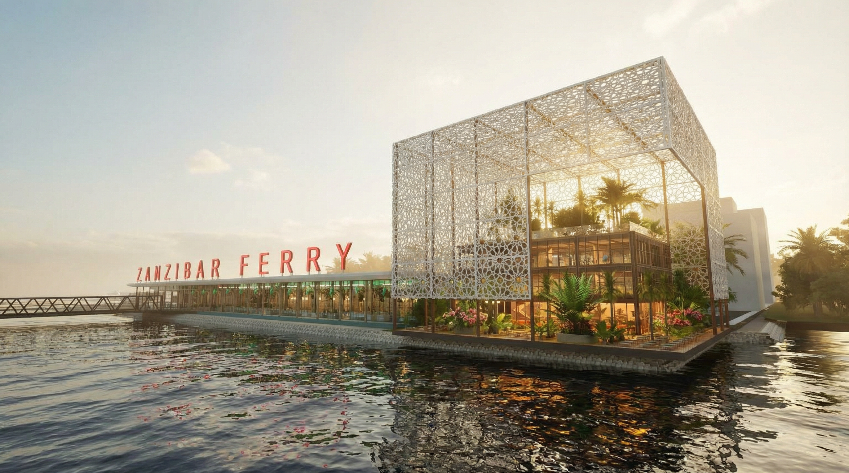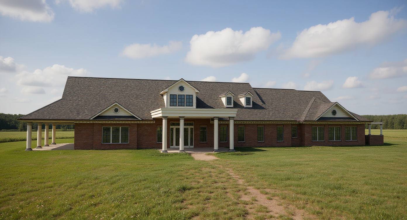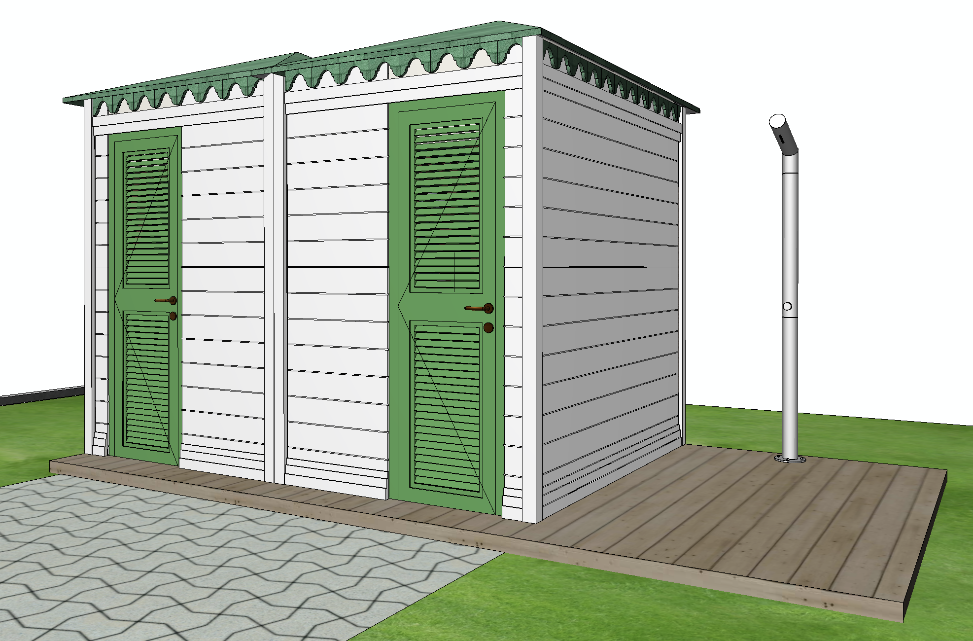 ultra photorealistic render of the exact changing room building shown in the reference image do not change any geometry proportions doors siding louvers roof trim platform shower pole textures or the camera angle keep every element exactly as modeled white pvc siding sherwin williams greek villa tone green louvered doors and green roof trim must remain exactly the same pvc deck platform exactly as shown same size and shape place the structure in a luxury west palm beach resort environment bright tropical daylight clean landscaping lush palm trees manicured lawns subtle ocean hints in the far background soft shadows warm sun gentle reflections