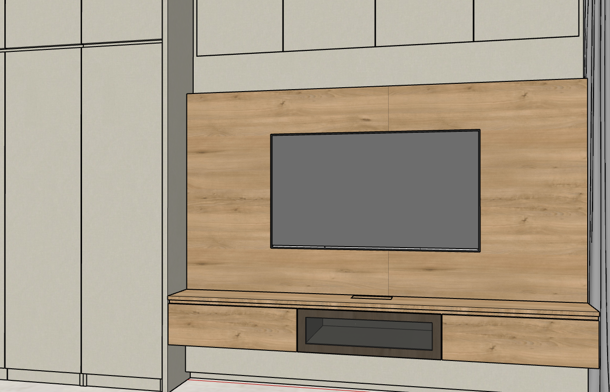 light marble flooring soft daylight from sliding doors on the right no interior light led strip light above tv wood panel led strip light below suspended tv console