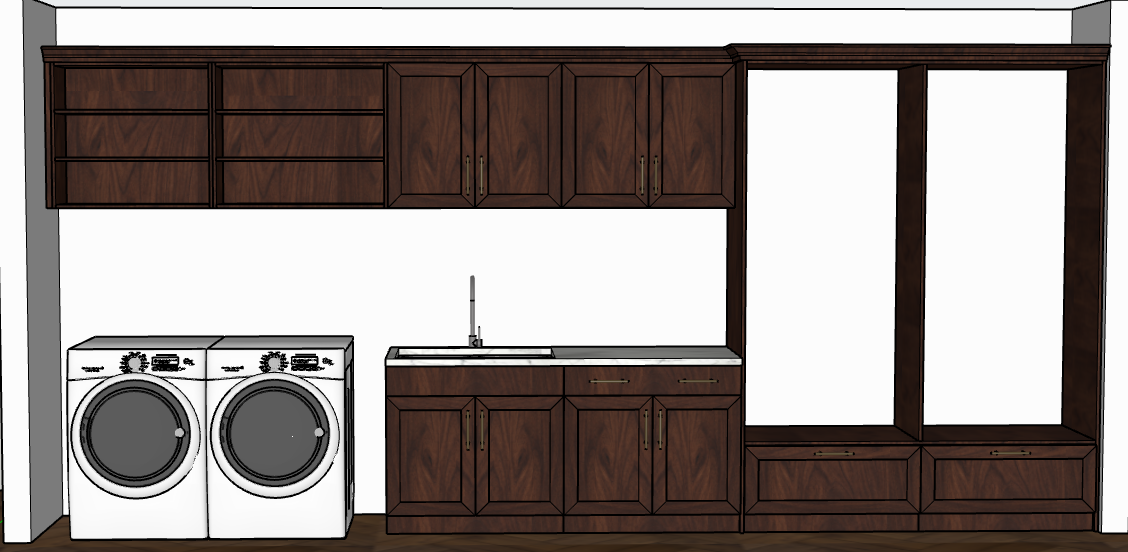 this is a wall in a hallway mudroom with beautiful natural stained knotty walnut cabinets there is a nice modern 2 step crown molding along the top of the cabinets all the handles are a brushed brass the open spaces to the right have a coat hanger in each the floor is a beautiful hard wood there is lots of natural light coming from the right out of frame the two upper cabinets on the left are open shelf cabinets
