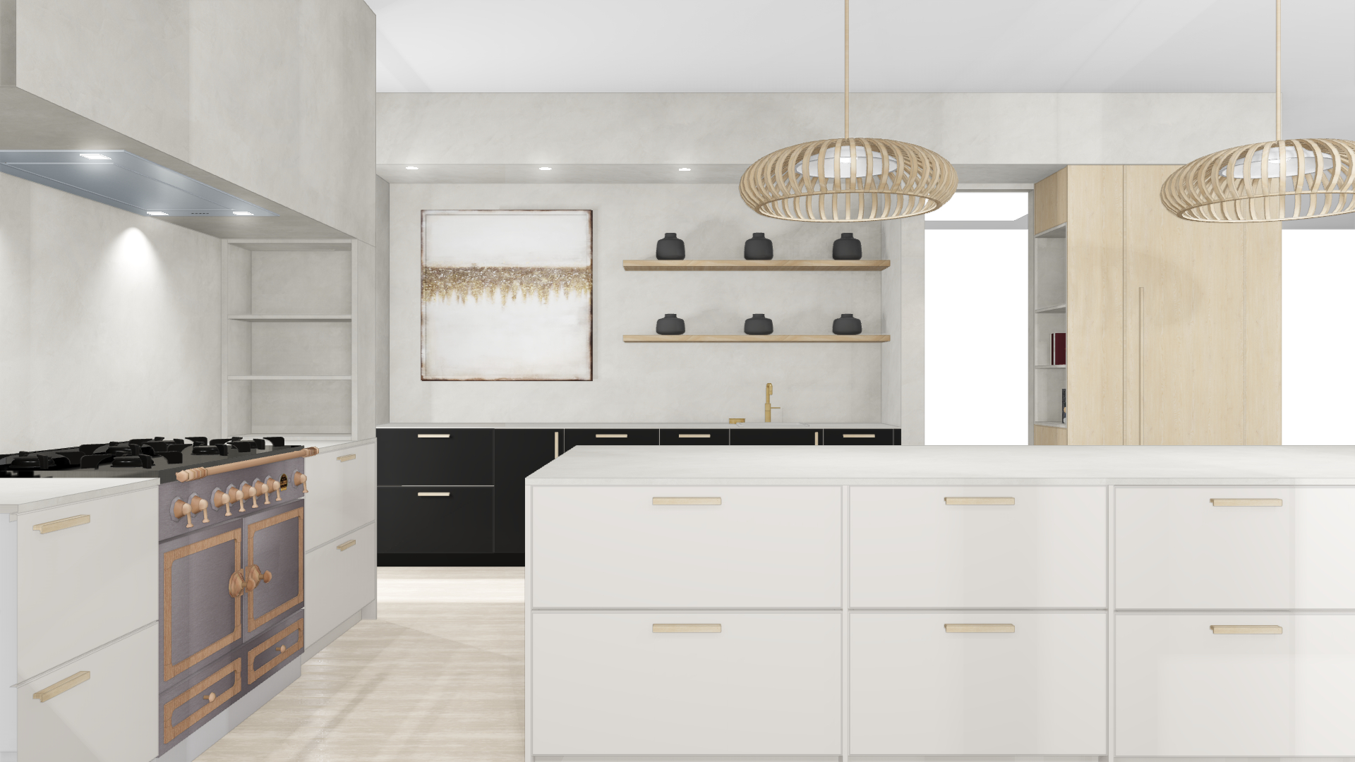 add flowers on the island moody light foggy sunny newton ma background behind the windows do not change cabinets nor add open shelves lights under the shelves light on above the countertop