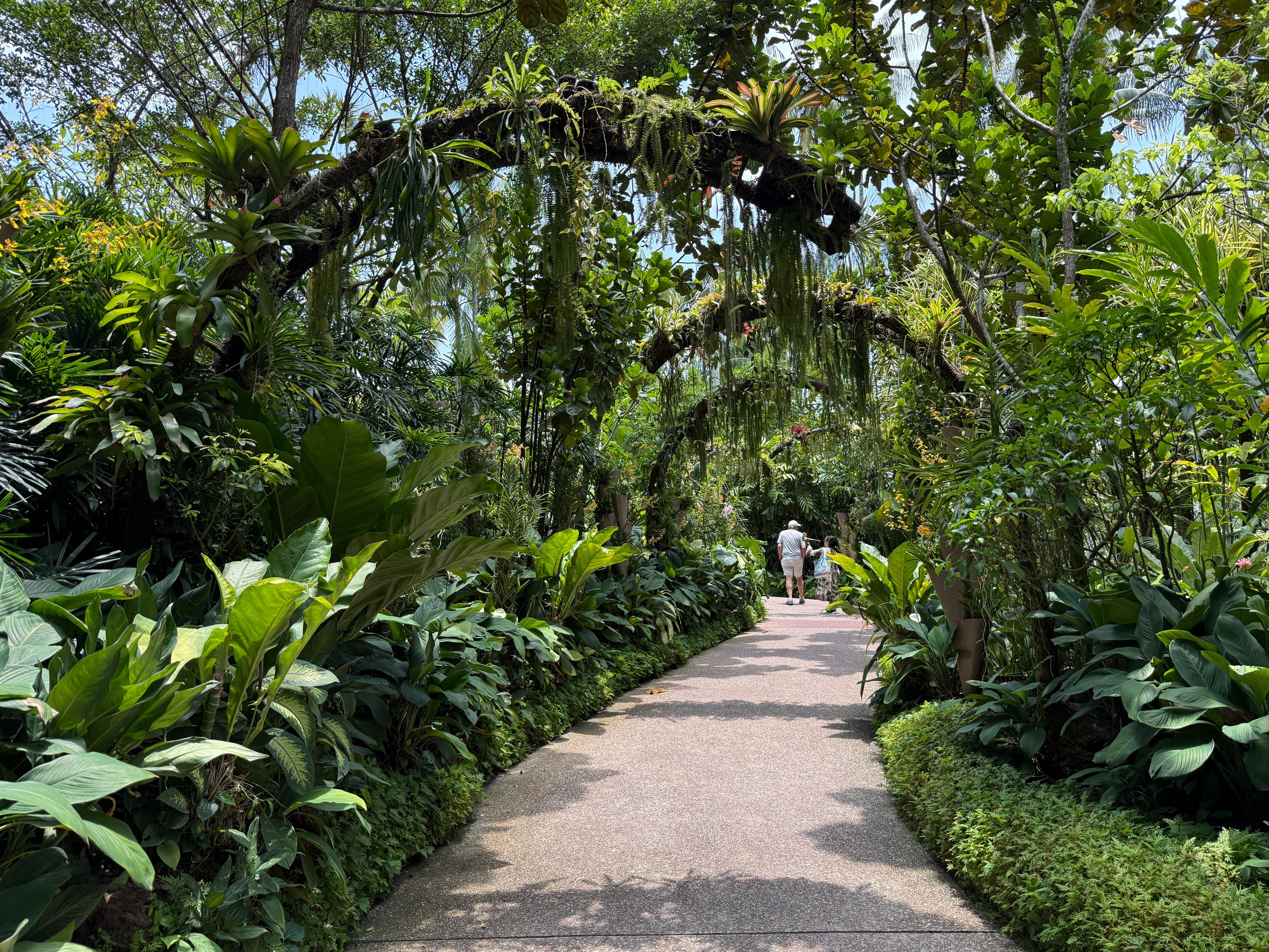 a render of a night installation at the singapore national orchid gardens numerous groups of people walk through the dark trail carrying oil lamp lanterns from the bottom of the lanterns is a light that shines the pathway and lights up the visitor s walking route