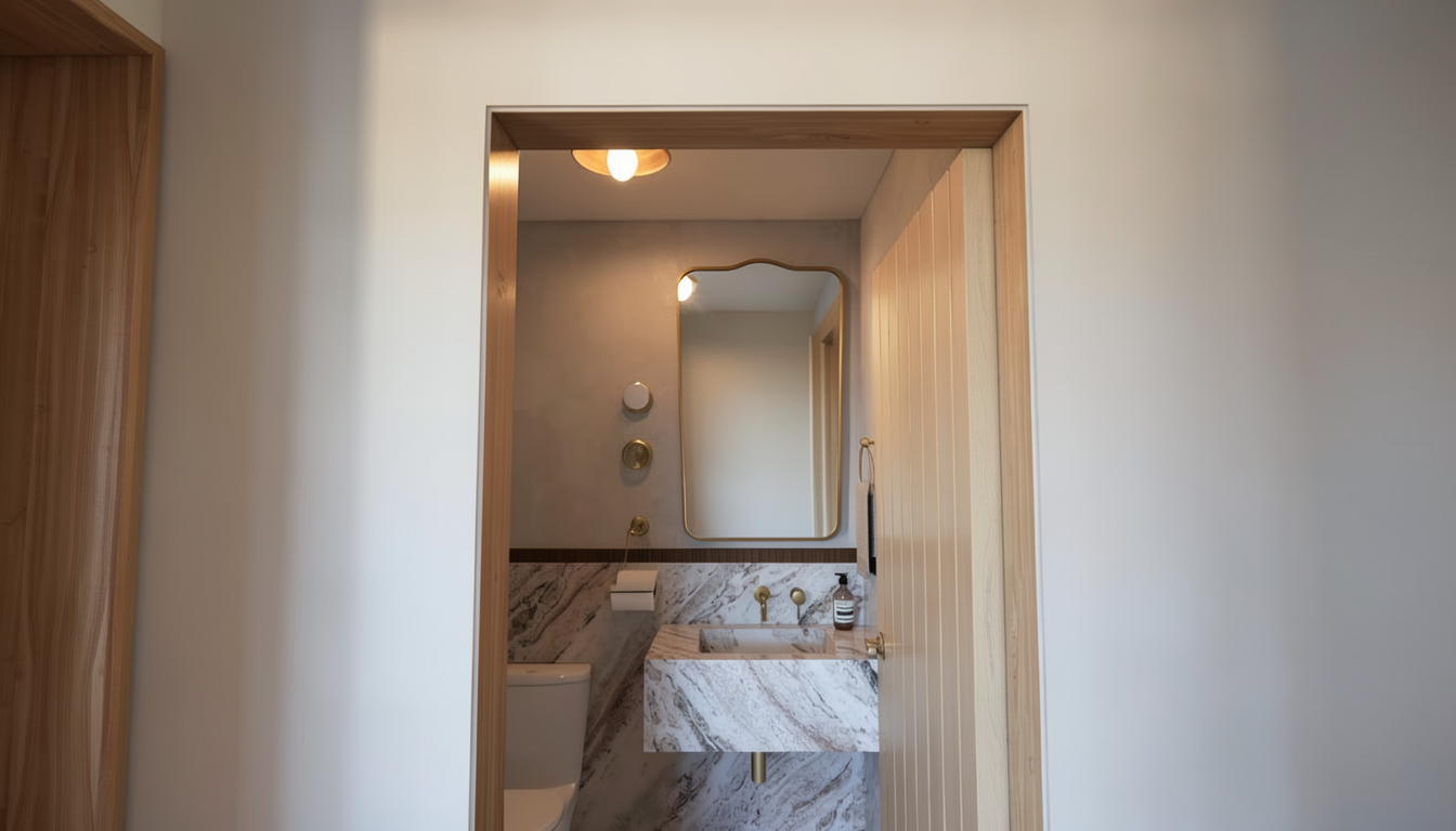 do not change the materials of the building and do not change the design of the building enhance the stone material and enhance the charcoal grey corrugated metal panels do not change the parking and road do not change the curb design this is a commercial building add hyperrealist grass in the green areas show slightly warm sunlight from the side building but do not change the charcoal grey color of the building add a light sky