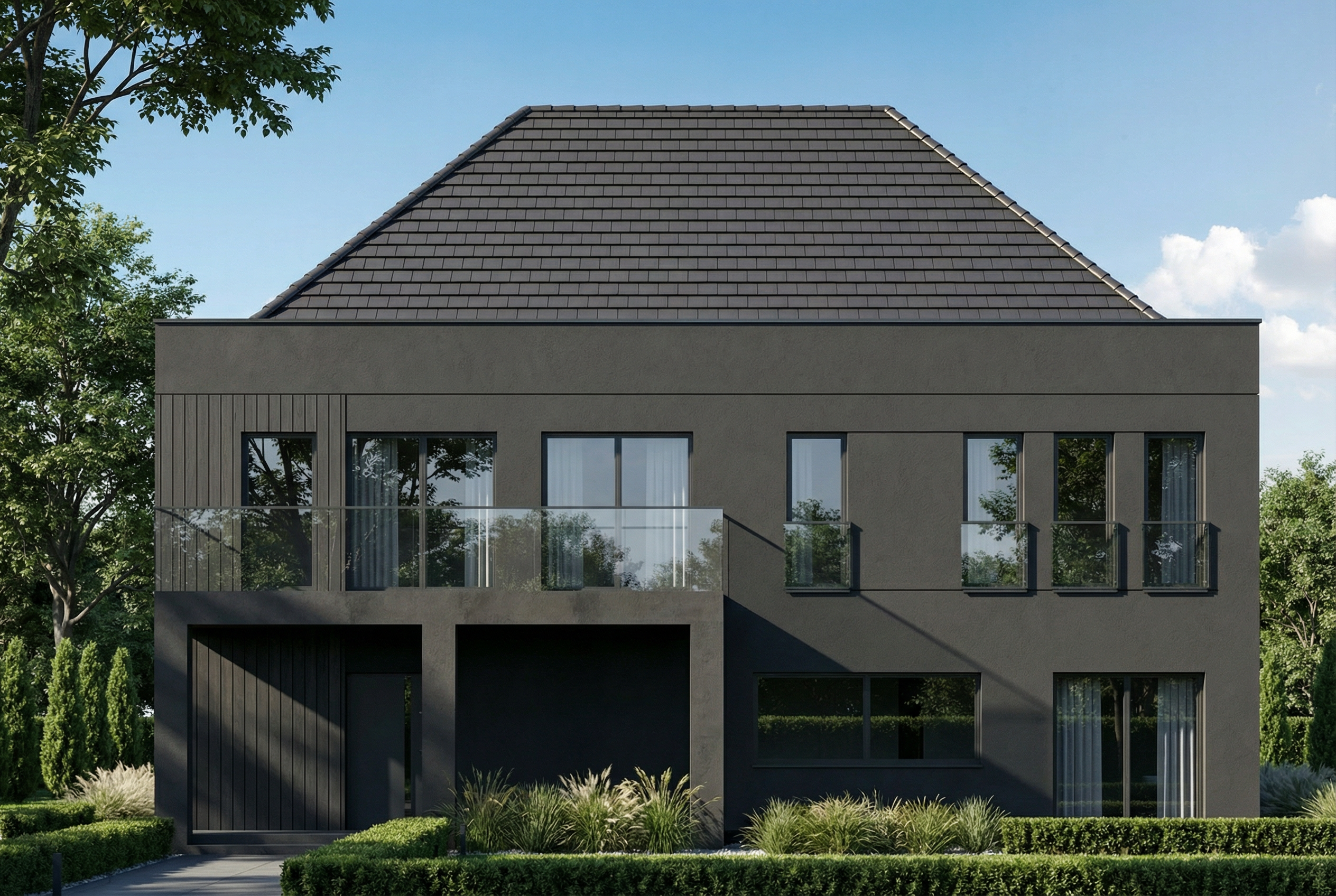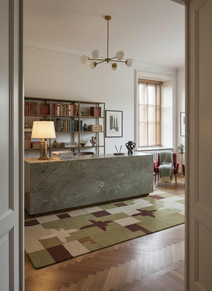 le pareti sono intonacate bianco caldo intonaco con texture come muri esterni mantieni tessuto divano aggiungi strip led sotto pensile cucina lavabo e rubinetto in acciaio spazzolato tavolo laccato bianco opaco mantieni mobile ingresso laccato verde accendi luci luce scena pomeriggio aggiungi tre vasi con piante aromatiche sul top cucina