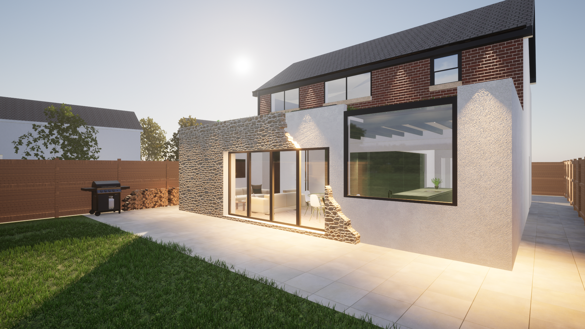add more landscaping and patio furniture and a mum dad and kid with a small dog