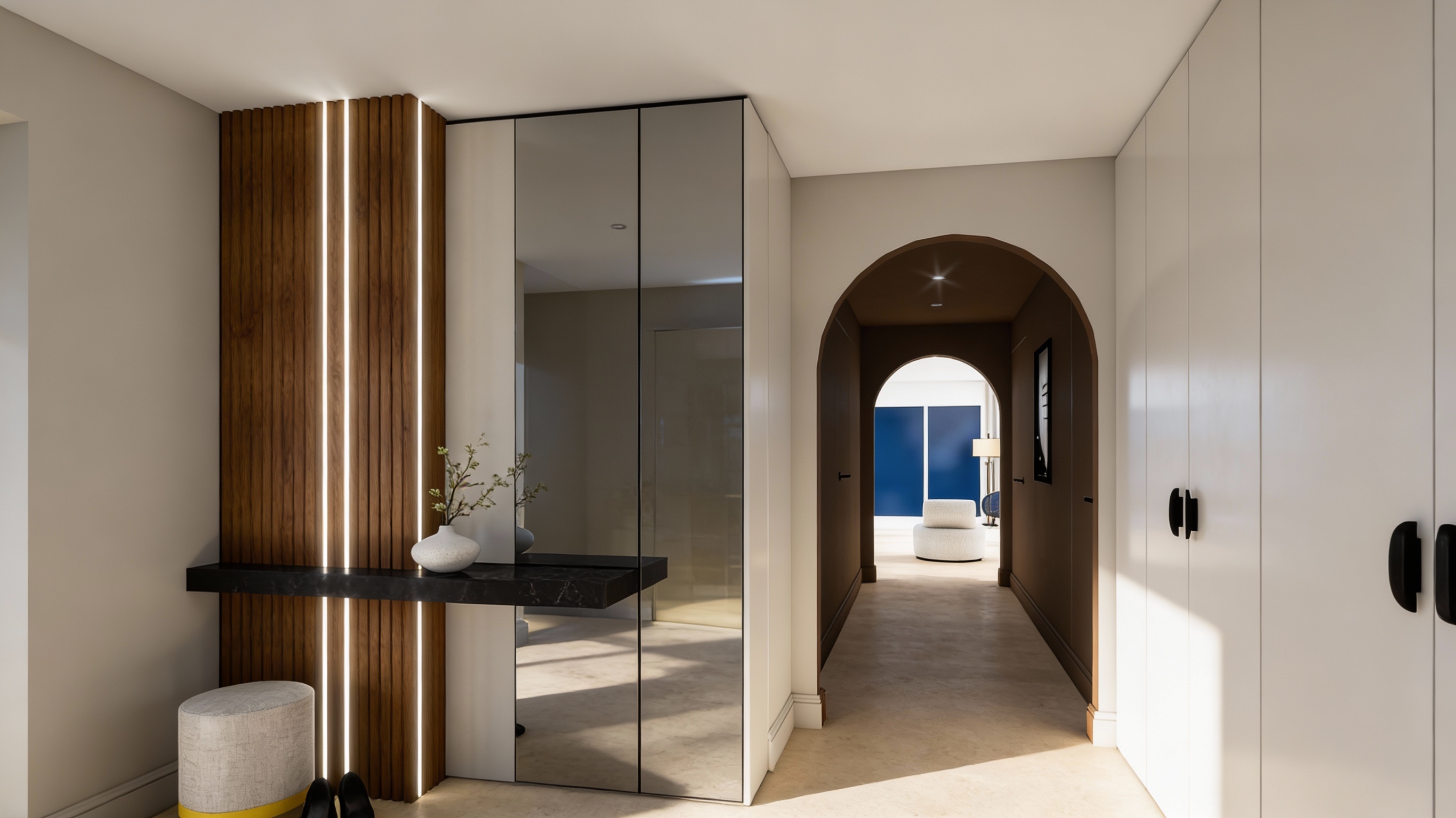 white bed and wardrobe one left door of the wardrobe mirror modern style