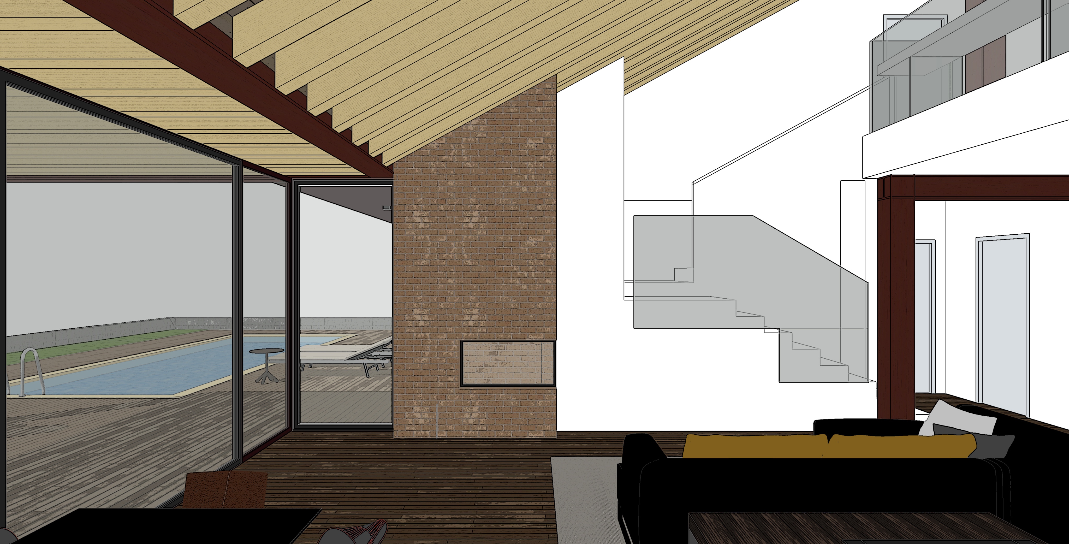 vista realistica di una zona living con travi del tetto in legno quasi bianco camino o con mattoni faccia a vista marrone chiaro pavimento in listoni di legno chiari serramenti in alluminio marrone scuro parapetto scala in vetro murature su scala in pittura bianca luce naturale realistica cielo nuvolosi sullo sfondo una site e alberature