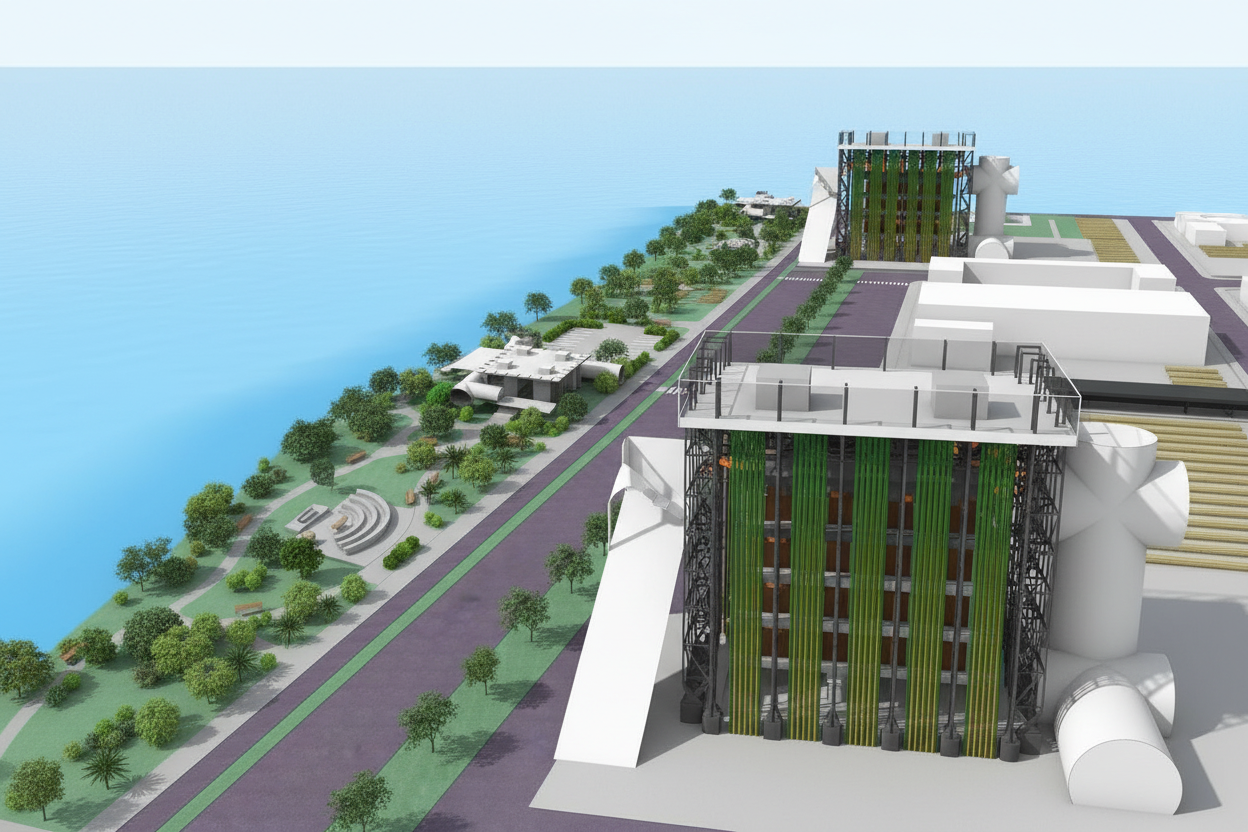 a high resolution architectural render of a large public building featuring a soft translucent bubble fa ade wrapping the entire volume retain the context surrounding landscape and outdoor setting the building mass is a simple solid rectangular prism with slightly softened edges and corners allowing the bubble geometry to flow continuously across all faces including corners no sharp rigid edges the white fa ade consists of irregular organic foam like cells with varying sizes appearing inflated and seamlessly connected creating a natural fluid pattern across the surface material is translucent pale blue tones with subtle reflections light diffusion and internal glow allowing light to pass through realistically the ground floor is recessed creating a shadow gap so the building appears to float above a transparent base similar to the water cube the recessed level includes glass curtain walls the fa ade begins above this recessed plinth level remove all excess circular perforations the roof is flat no domes and no skylights integrated cleanly into the bubble system maintain a balance between solid mass and selective voids surroundings include a landscaped public plaza soft greenery pathways and people for scale style highly realistic architectural visualization clean minimal contemporary parametric design language