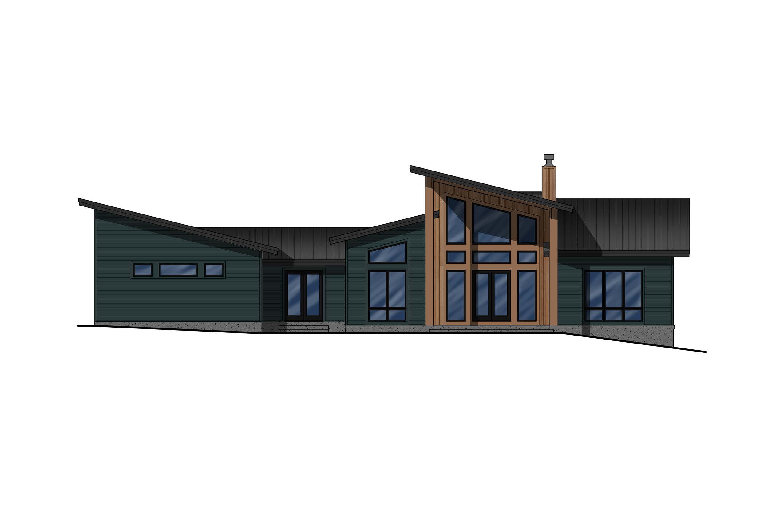 create photo realistic perspective of this home keep the colors the same just enhance the details warm vertical wood siding in the center with a deep covered porch deep dark green horizontal siding on the main house and chimney with black windows and fascia with a black metal roof render on a sunny day with lots of vegetation nestled into a wooded setting with a landscaped front yard