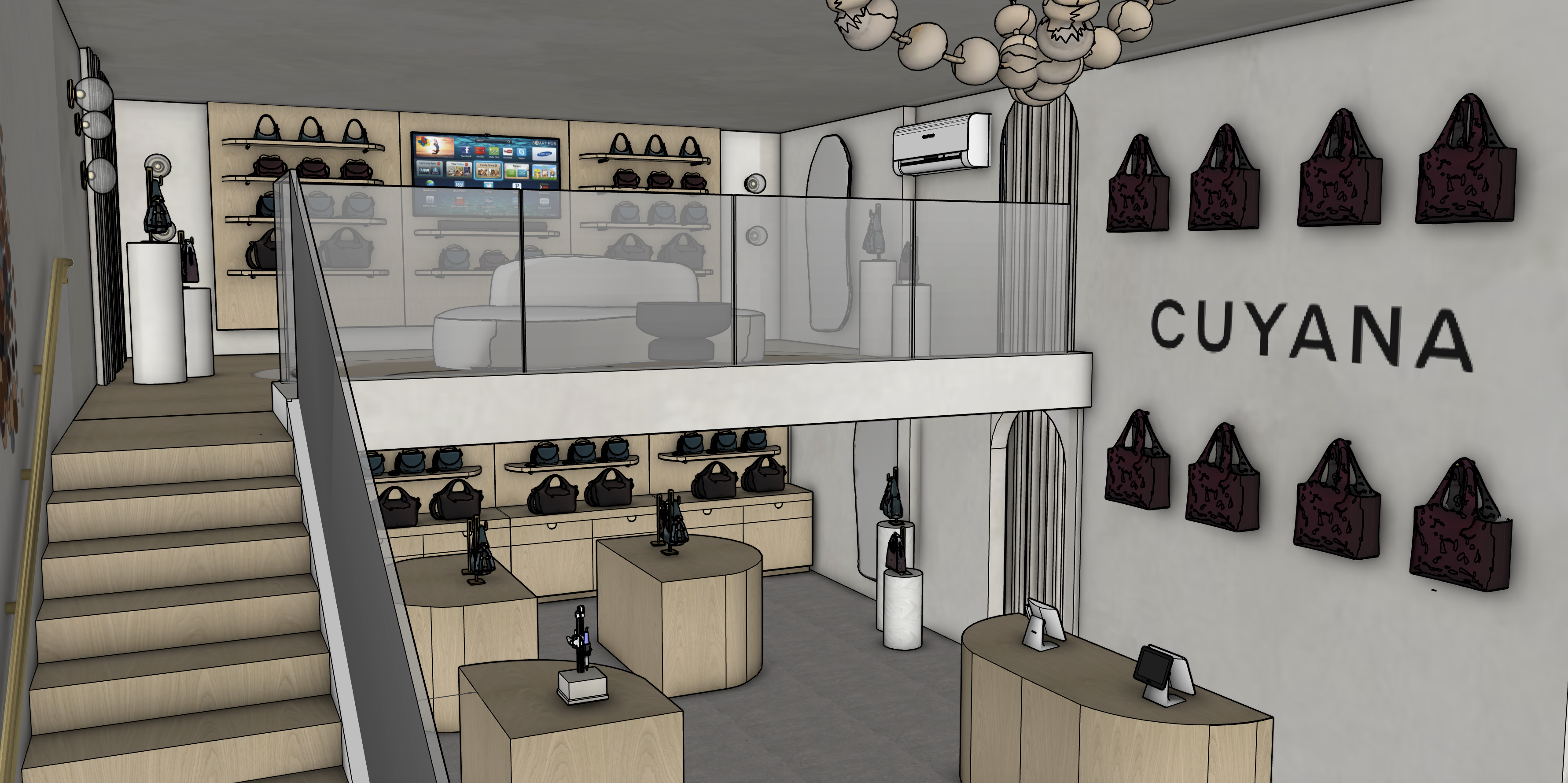 make photorealistic turn on chandelier add recessed lighting to the ceiling add cement floors to bottom floor