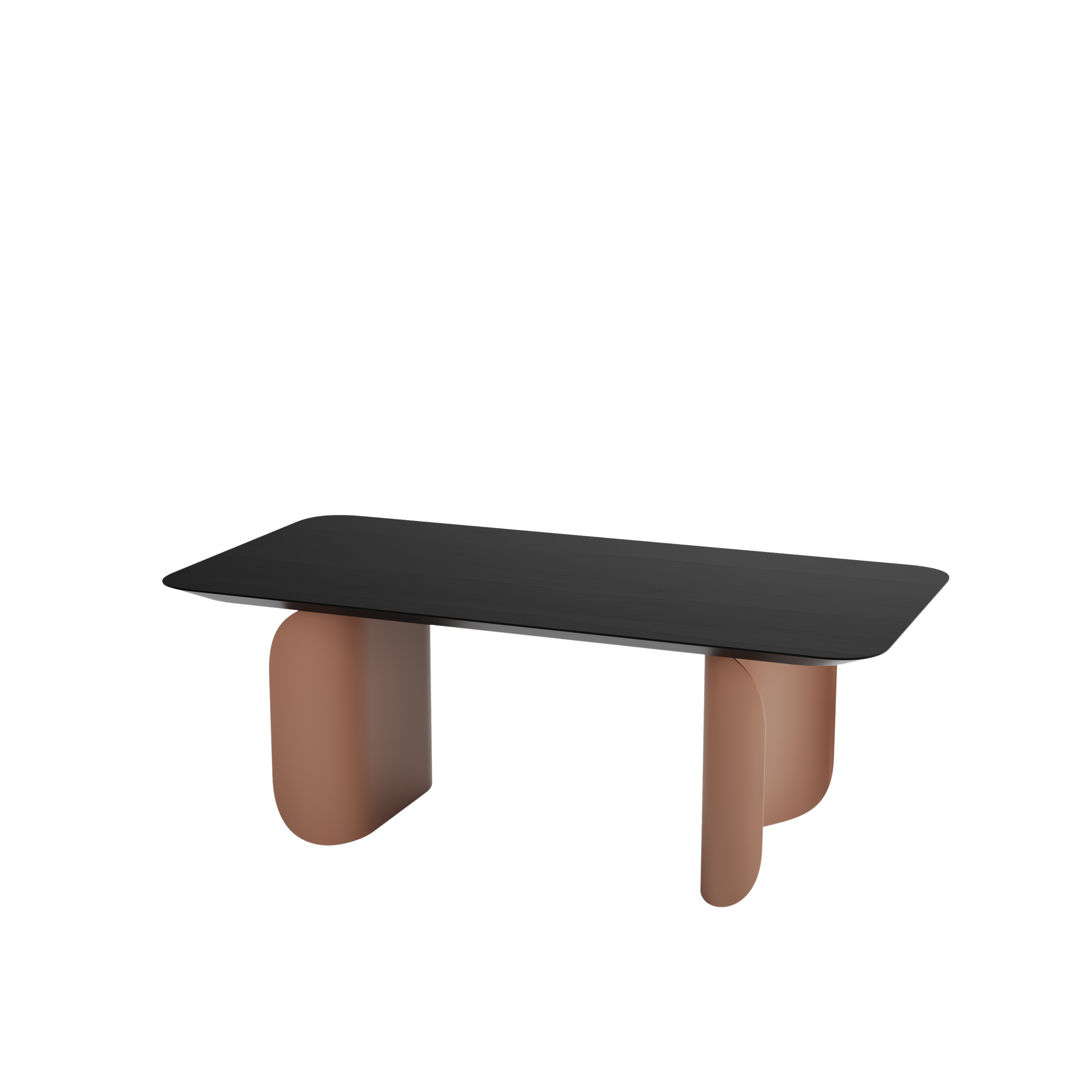 ignore the original table height and leg length destructive geometry transformation cut off the original legs completely rebuild new legs from scratch do not preserve original vertical proportions create a low coffee table final dimensions mandatory total height 45 cm tabletop 100 cm 90 cm leg reconstruction rules legs must be short wide sculptural supports legs must visually occupy no more than 40 of the table height legs must feel grounded and low not elongated design language keep the same shape style curved organic monolithic but scaled for a lounge level coffee table absolute exclusions dining table height tall legs preserved original proportions camera rendering camera placed at seated eye level 45 cm studio background strong contact shadows to emphasize low height
