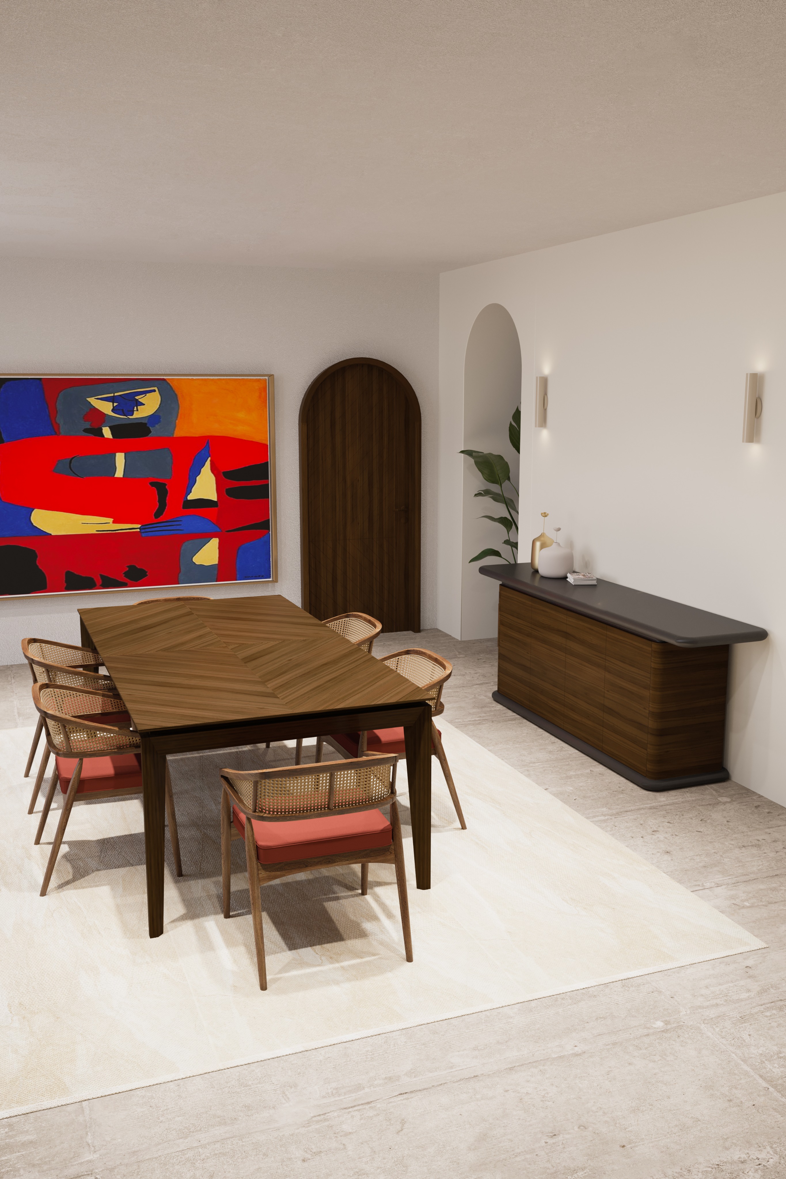 refined contemporary luxury dining room styling with a sophisticated and balanced composition on the wall above a wooden sideboard with rounded corners and a glossy black overhanging top place a large abstract painting that becomes the main focal point of the wall the artwork should feature expressive brush strokes in deep red burgundy and vibrant golden yellow tones creating a bold yet elegant contrast with the neutral wall on each side of the painting install two minimalist vertical wall sconces in brushed brass the sconces should emit a warm and soft ambient light that gently washes the wall creating a symmetrical and refined gallery like presentation around the artwork on top of the sideboard create a curated decorative composition a sculptural matte ceramic vase in a soft beige tone a slim brushed brass cylindrical decorative object to introduce a metallic accent and a small stack of elegant coffee table books placed horizontally the arrangement should feel balanced minimal and luxurious above the dining table place a refined linear pendant light with a sculptural minimalist design the fixture should consist of a long horizontal bar made of white marble with subtle natural veining suspended by two thin brass rods from the ceiling the pendant should emit a soft warm light that gently illuminates the dining table below enhancing the materials and atmosphere without harsh shadows the overall styling should feel elegant minimal and sophisticated with warm tones natural materials and a curated high end interior design aesthetic