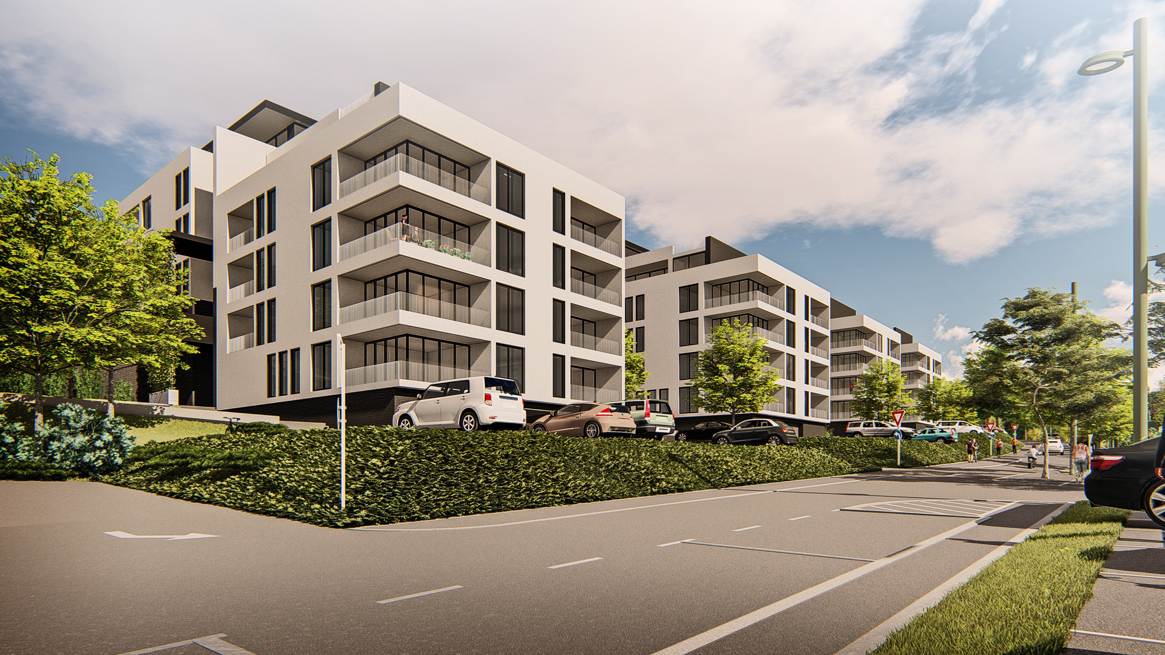 important preserve the existing geometry and the existing context exactly as provided do not modify alter reinterpret add remove scale or reshape any geometry do not change the site surroundings street layout neighboring buildings vegetation or context elements do not modify geometry scale proportions buildings road layout sidewalks or surrounding context in any way do not change text photorealistic architectural rendering clean and balanced contrast calm cinematic mood style contemporary european residential architecture minimalist premium understated include people subtle motion blur for realism keep the green roof do not add new people do not change the green space do not change the sidewalk do not change the road