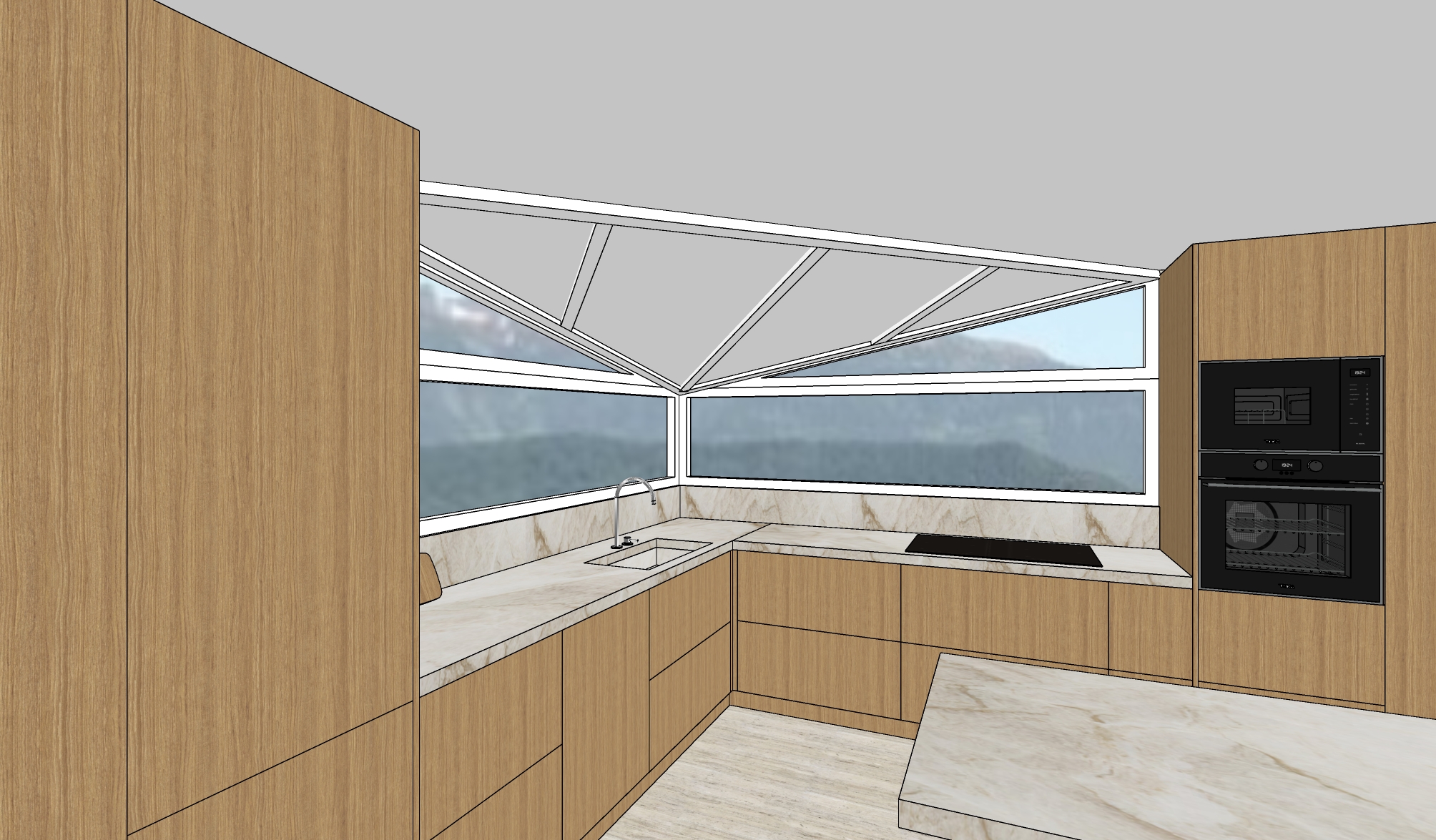 cuisine avec fa ades en ch ne clair pln de travail en quartzite perla venata paysage en arri re plan montagne sol en travertin
