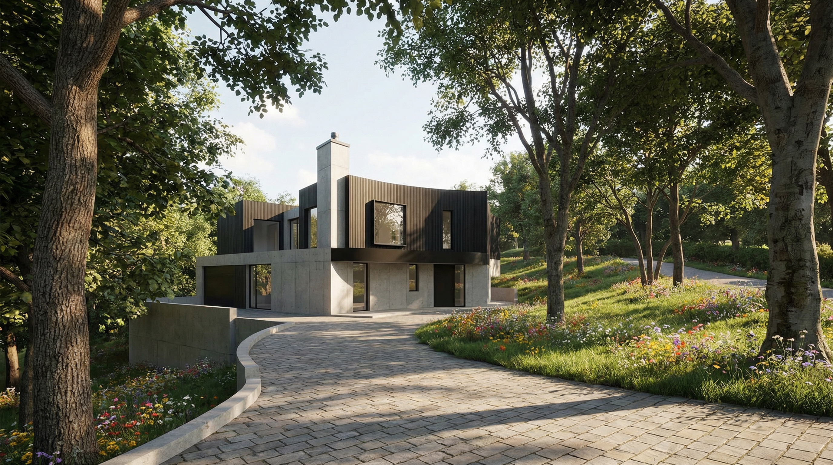 preserve exact geometry no changes to balcony grid no new shapes no added details keep facade windows and proportions exactly as in the original image do not change the balcony grid window rhythm or fa ade proportions no adding or removing details change buildings facade to terracotta ral 3012 smooth plaster facade make widows frames in terracotta not change balconies geometry make horizontal stripes on front building lighter