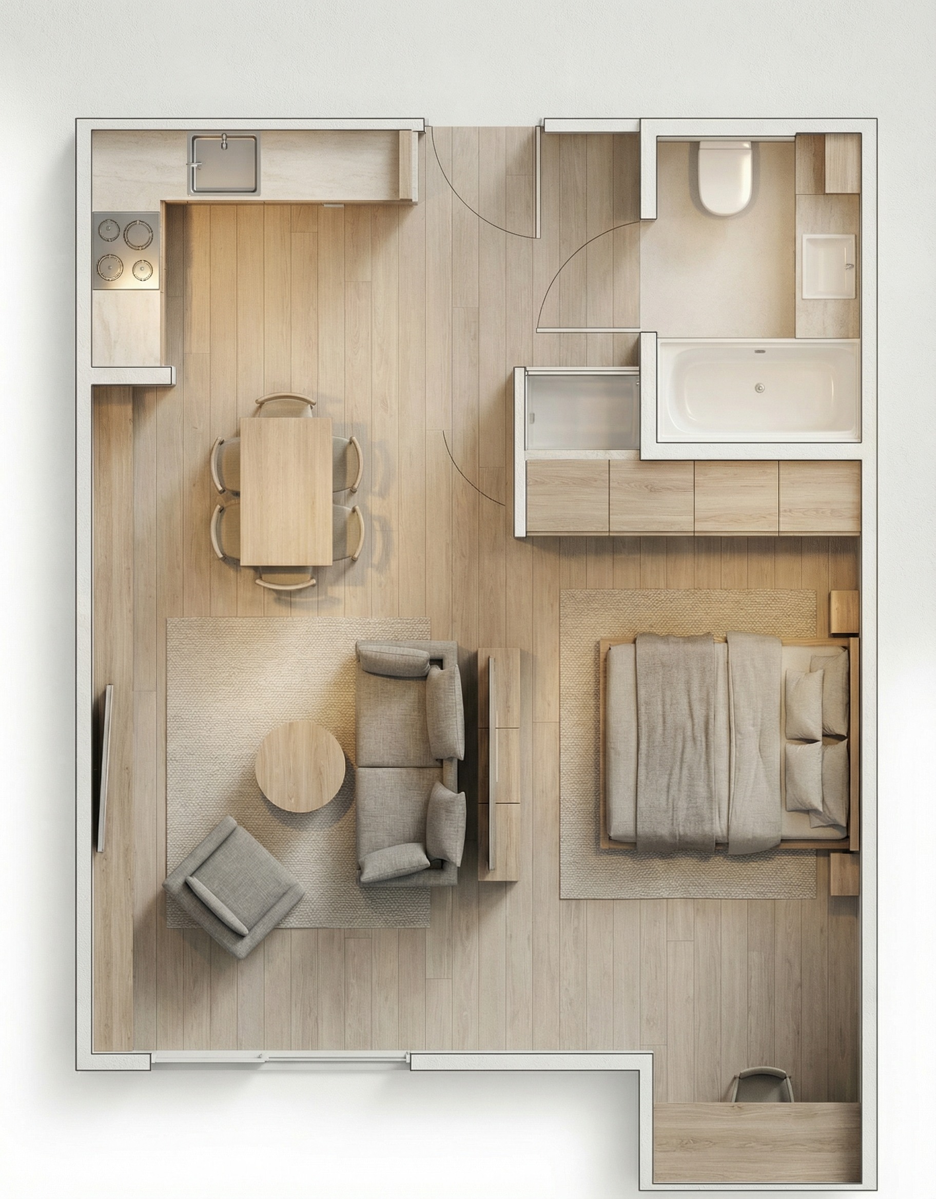 zaktualizowany prompt do archsynth en top down architectural floor plan render of a one bedroom apartment 40 sqm photorealistic 3d bird s eye view japandi scandinavian style overall color distribution 60 light clean wood tones knot free smooth grain uniform pale blonde 30 earthy muted tones dusty terracotta warm clay muted olive soft sage 10 pure white surfaces light blonde whitewashed knot free hardwood flooring with vertical planks throughout clean smooth uniform grain with no knots or imperfections open plan layout l shaped kitchen in the top left corner with induction hob 4 burners integrated sink upper wall cabinets in smooth knot free pale wood pure white marble countertop and extractor fan rectangular dining table and chairs in clean knot free light blonde wood living area in the bottom left with a muted dusty terracotta area rug warm clay adobe two seat sofa soft sage green armchair round pale wood coffee table wall mounted tv panel bathroom in the top right corner enclosed by walls with rectangular freestanding white bathtub white toilet pale wood vanity cabinet door with arc swing indicated bedroom in the bottom right with queen size bed with headboard in clean pale wood against the right wall muted olive warm linen bedding one pale wood nightstand smooth pale wood dresser unit between bedroom and bathroom dusty warm taupe bedroom rug walls constructed from exposed cross laminated timber clt smooth knot free clean pale blonde layered wood grain on all wall surfaces no knots no dark spots no imperfections perfectly uniform light wood lamination lines only clt wall thickness visually prominent in top down view showing clean layered cross section pattern at wall ends strict color palette rule 60 of all visible surfaces in smooth clean pale blonde wood floors walls furniture frames cabinetry 30 in earthy muted natural tones exclusively on upholstery and rugs dusty terracotta warm clay muted olive soft sage all desaturated and chalky 10 pure white on countertop bathtub and toilet only zero saturated vivid or synthetic colors anywhere photorealistic lighting and shadows soft natural daylight entering from the bottom wall through large windows casting subtle warm directional shadows northward toward the top of the plan all furniture shadows projected upward away from the window wall ambient occlusion under sofas bed frame chairs and table legs bright sunlight pool on the floor near the bottom wall fading gradually toward the top of the plan gentle self shadowing on pale knot free clt walls with clean wood grain catching the light white marble kitchen countertop reflecting soft specular highlights soft specular highlights on the bathtub rim realistic material rendering smooth knot free light blonde floor texture pale clean clt wall grain white marble countertop sheen fabric micro texture on sofa and rugs ceramic sheen on toilet and tub ultra realistic high detail cgi render orthographic top down view 8k resolution