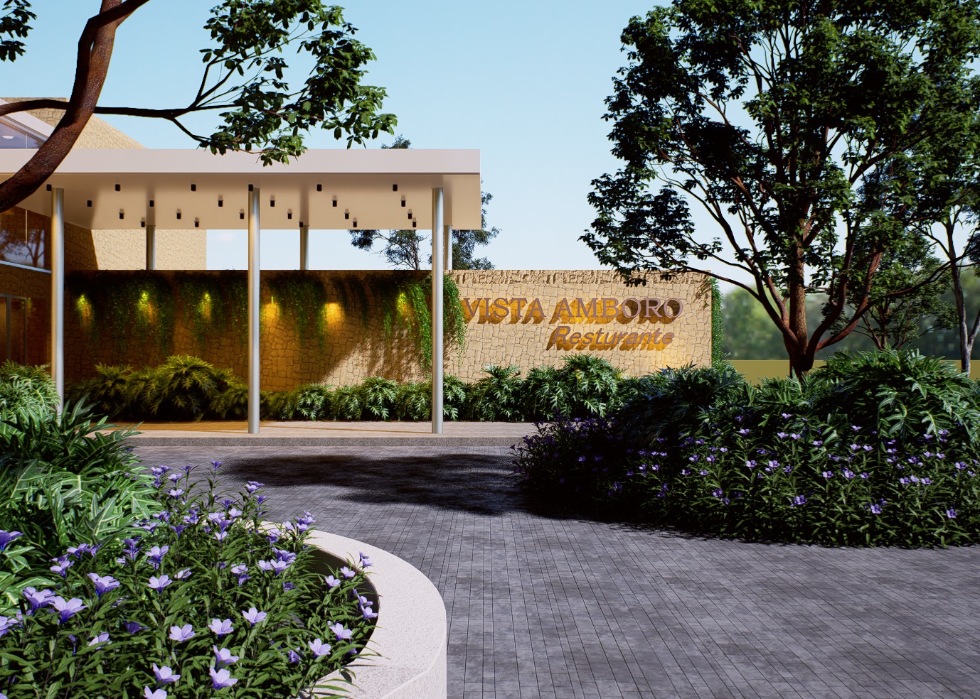 clearly keep the architectural style materials and textures emphasizing natural stone walls with warm earthy tones sleek modern design and elegant white pillars supporting a minimalist overhang preserve and emphasize the exact logo text vista amboro resturante no spelling changes placed on the stone wall with a subtle hidden backlight creating a soft halo glow behind the lettering describe composition and camera perspective eye level slightly wide angle view cinematic framing with the entrance as the focal point and natural depth leading through the walkway include environmental richness lush green foliage landscaped garden and vibrant purple blossoms surrounding the entrance under a clear blue sky add human presence high class elegantly dressed guests entering the restaurant captured mid motion conveying exclusivity and liveliness specify lighting natural daylight soft shadows cast by the overhang and pillars gentle highlights enhancing textures and greenery