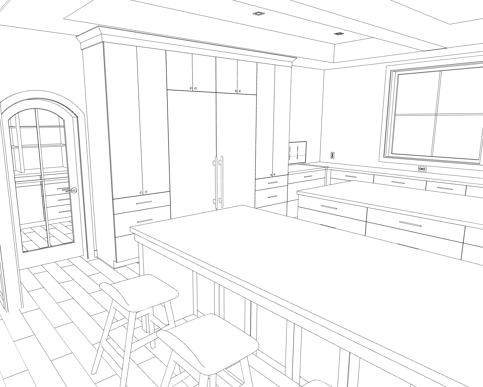 flooring will be vogue 9 1 4 hickory red oak hardwood all base cabinetry will be quartersawn white oak slab style pantry on either side of the fridge and panel ready fridge and freezer will be slab style in benjamin moore eucalyptus countertops will be pegasus honed marble windows will be black with white casing door into pantry area will be black grid style ceiling and walls will be a venetian plaster kitchen stools will be mori counter stool by sunpan keep everything as is