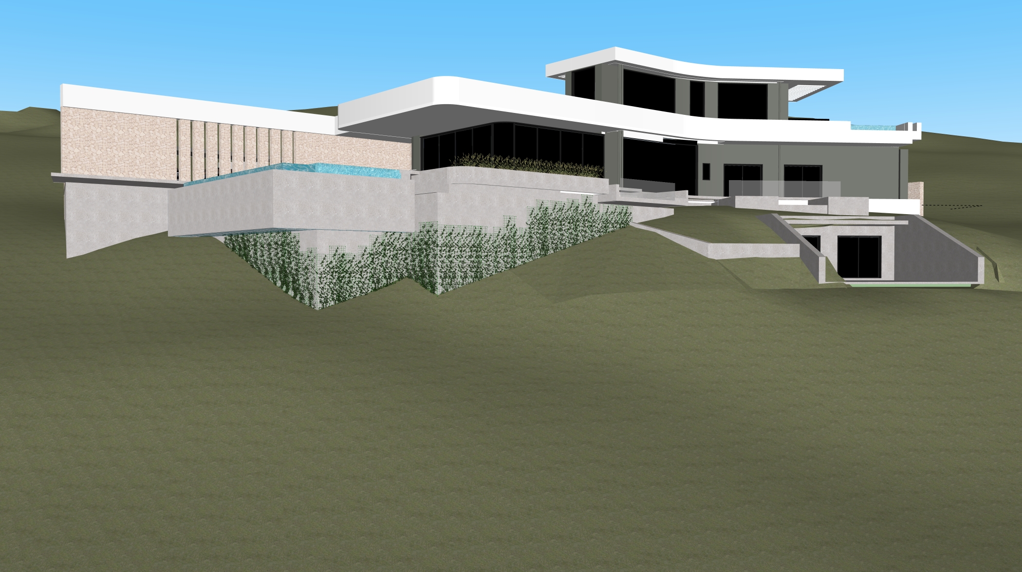 modern hillside mansion with sleek geometric lines use white and light beige for the main building facade incorporating large black tinted glass windows the roof is flat and pristine white include a turquoise infinity pool extending at the forefront emphasize the greenery with lush realistic vines and shrubs in various shades of green around the foundation and cascading down the slope the landscape features rolling hills in muted olive green set against a bright blue sky creating a tranquil and luxurious atmosphere bathed in warm natural sunlight
