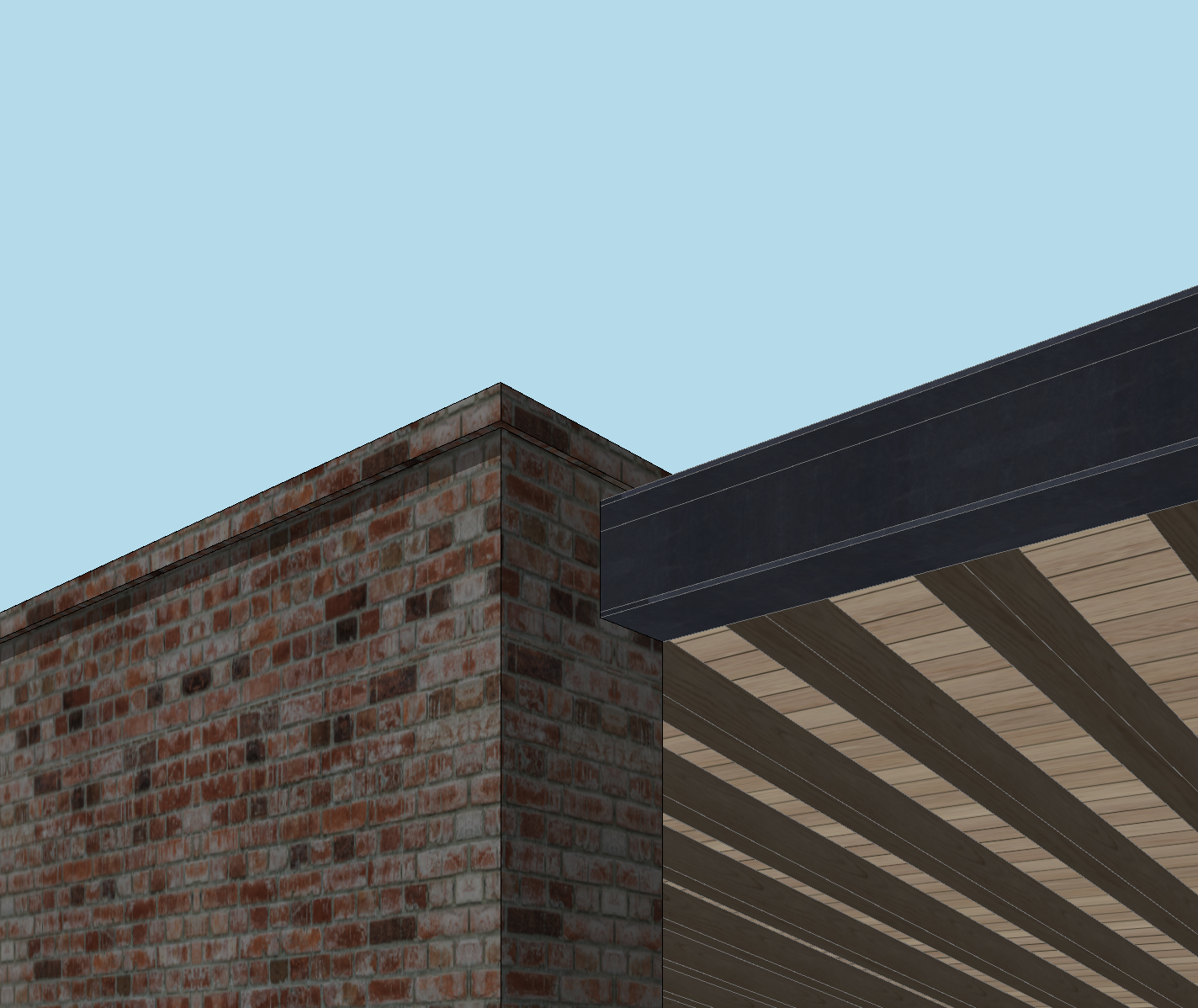 detail shot of a an i beam resting in a thick brick wall supporting a timber framed roof brick to be sacked recycled brick