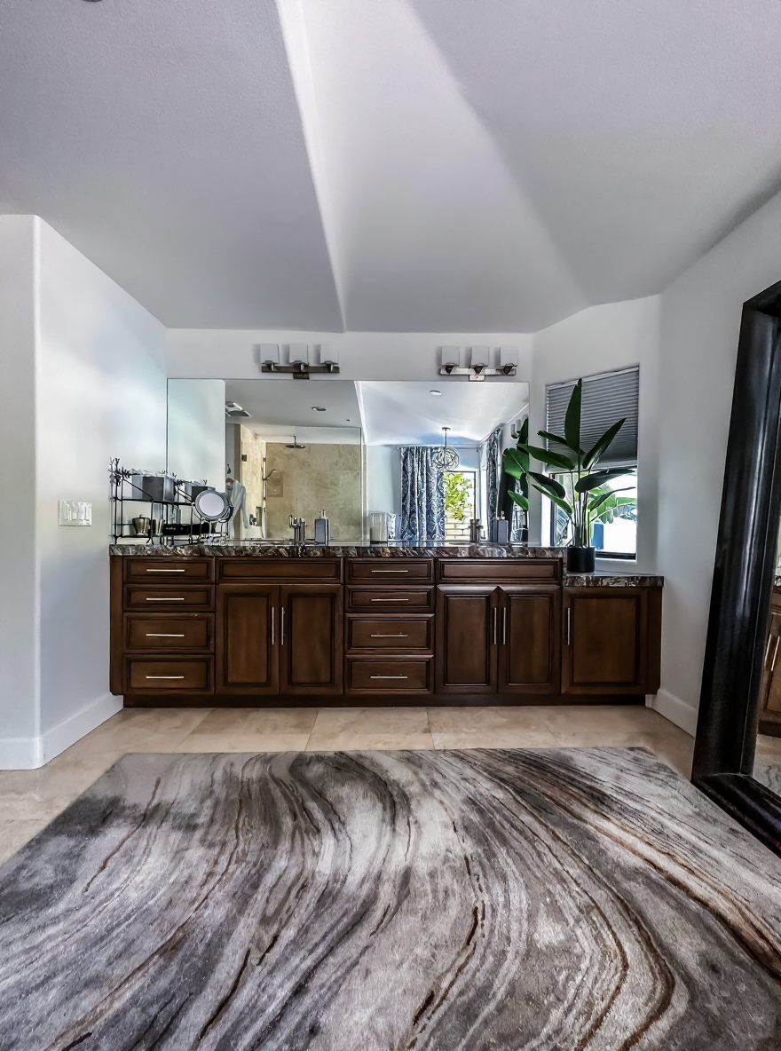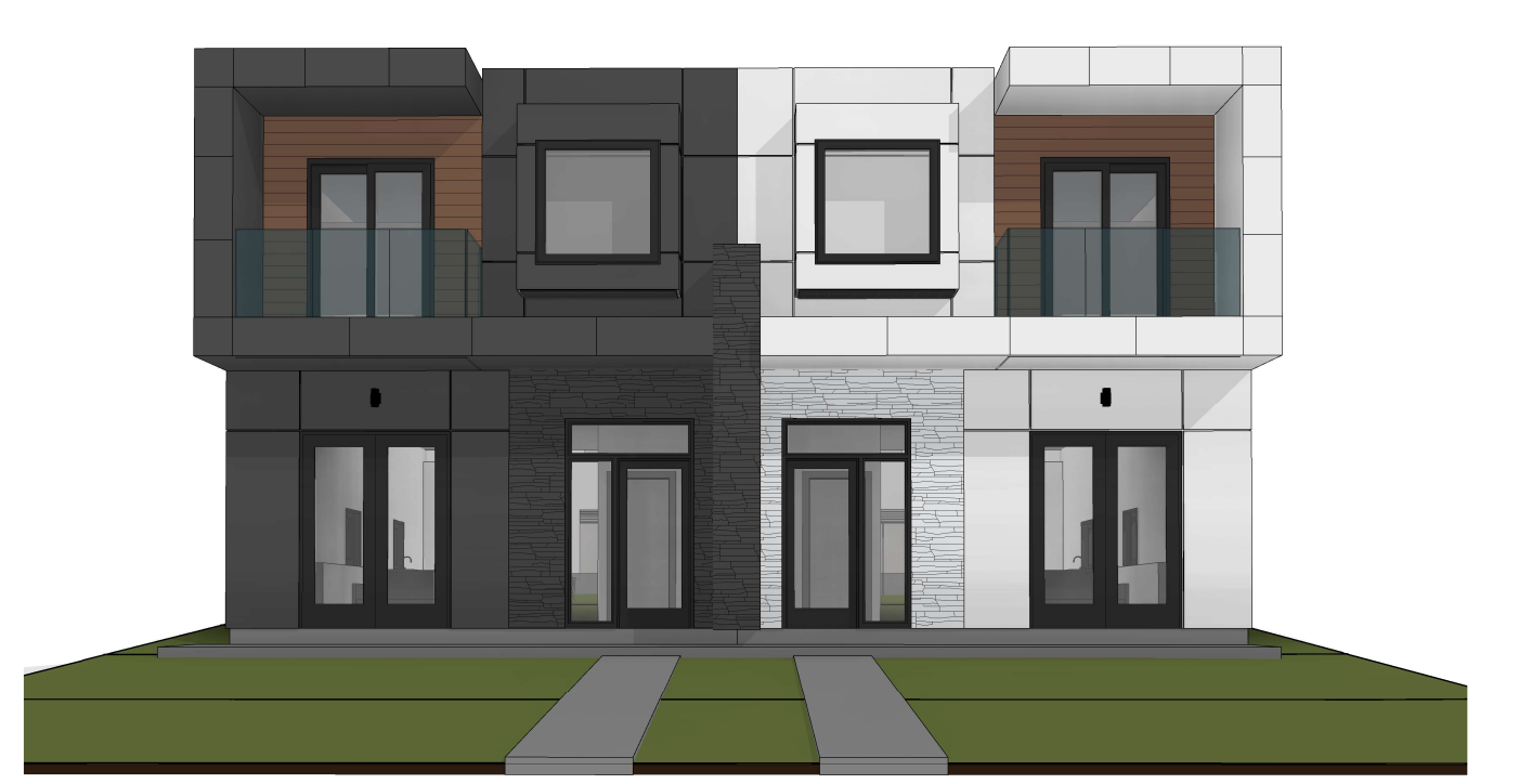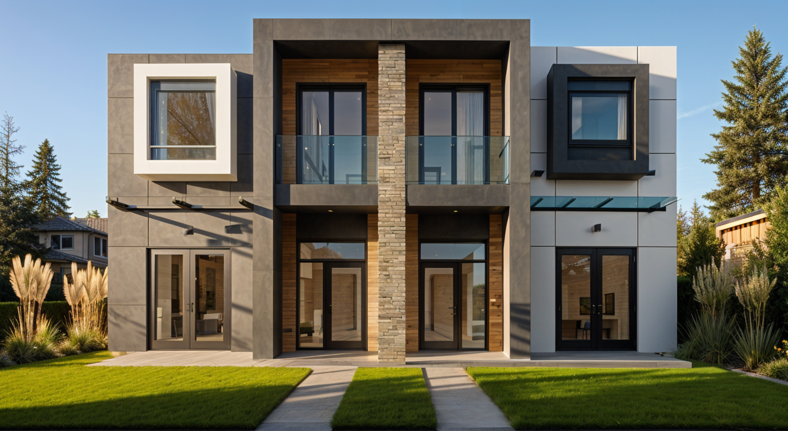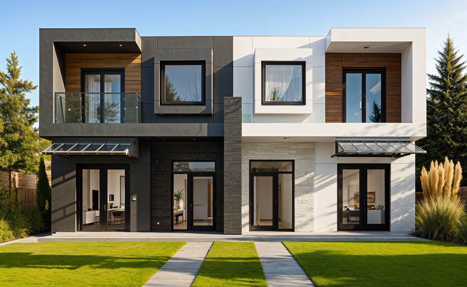 render a modern two story house with a minimalist design the exterior walls are smooth combining dark charcoal gray and clean white tones the central section features a wood textured finish in warm brown include large glass windows and sleek glass railings in a reflective cool blue the front lawn is lush green and the driveway has a smooth concrete texture the atmosphere is a bright and sunny day with a clear blue sky casting soft shadows to enhance the structure s geometric lines lush seattle neighborhood landscaped with tall pampas grasses and cedars