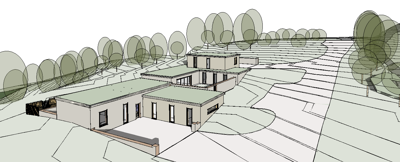 render two modern dwellings made from natural stone and timber with green roofs set in steep topography with trees and foliage surrounding them