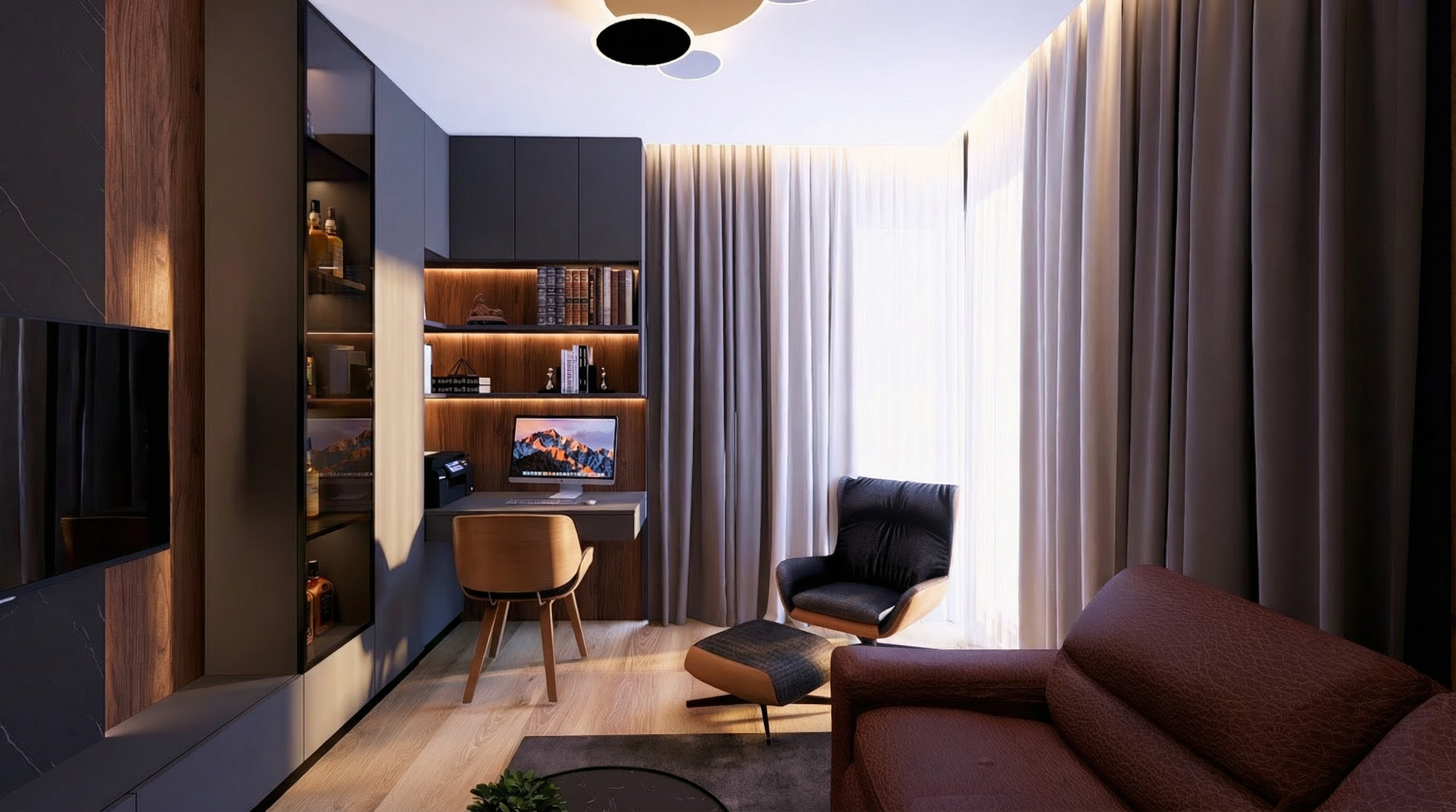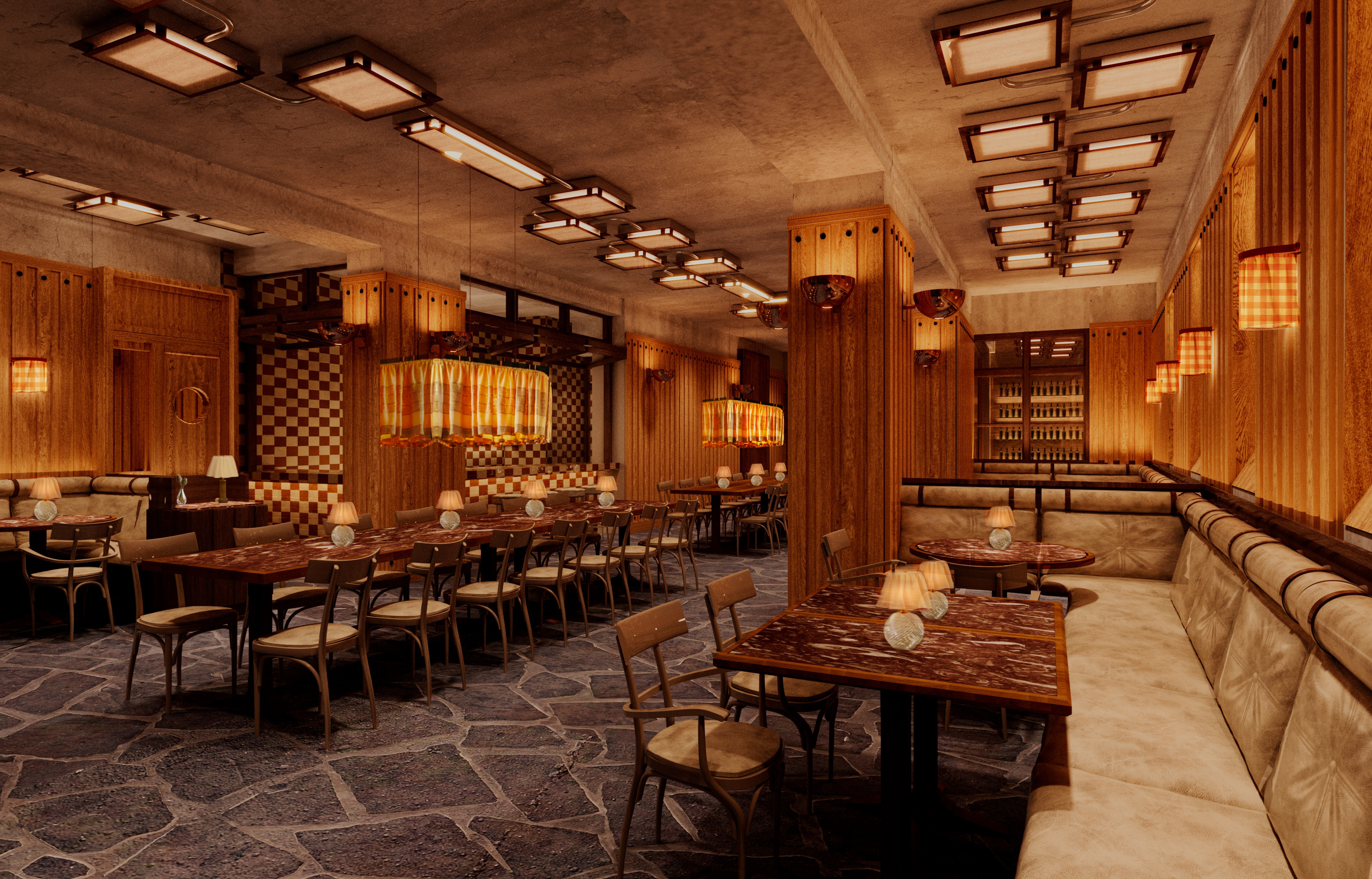 replace the existing stone floor with wide plank pine flooring installed at a precise 45 degree diagonal orientation the wood should be espresso stained pine with visible grain variation matte finish long wide planks consistent directional alignment across the entire room maintain exact room geometry and perspective keep all furniture walls ceiling and lighting unchanged do not alter furniture do not modify walls no marble no stone texture no lighting change no color temperature shift no change in camera angle