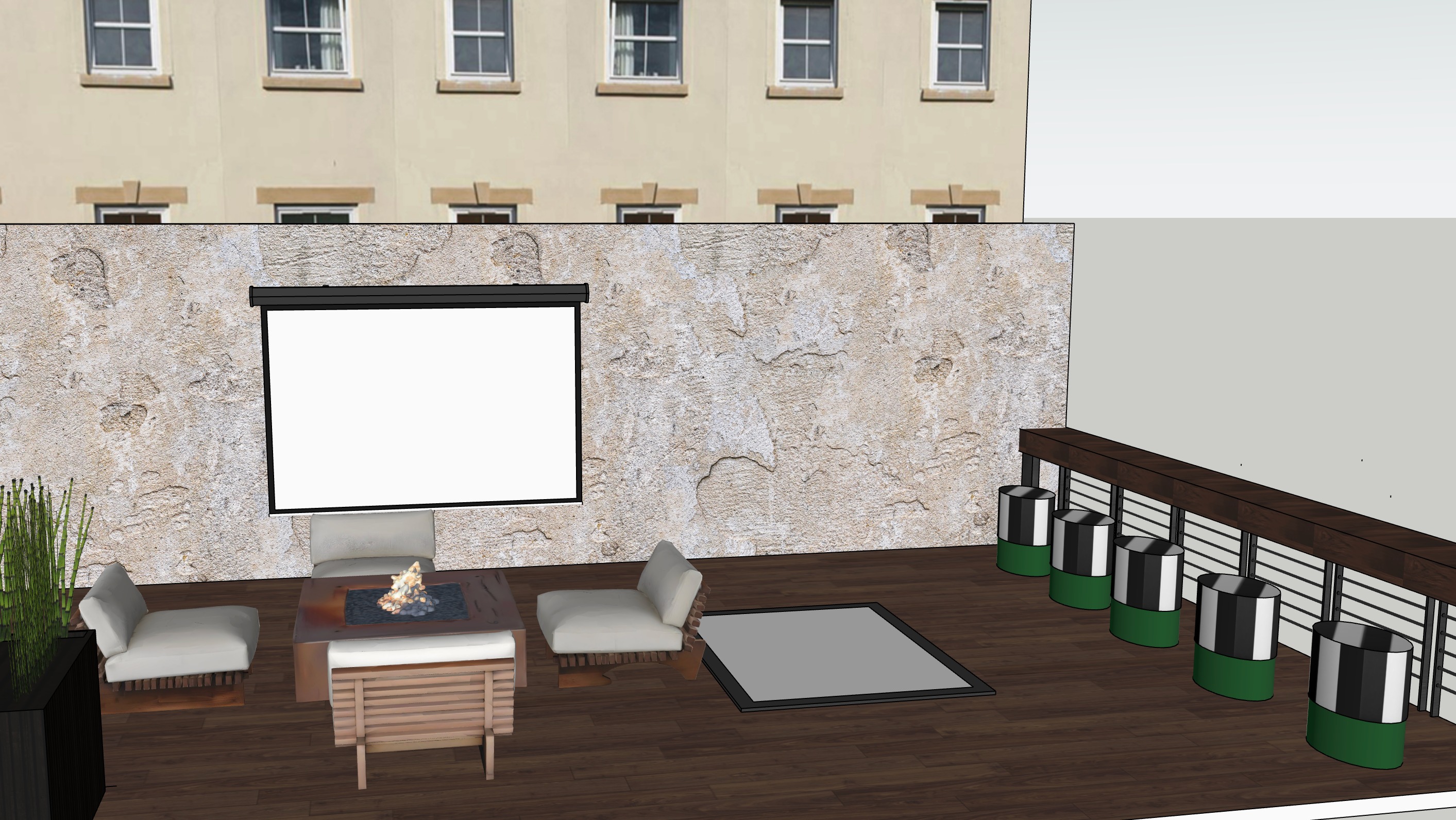 show patio at golden hour add string lights and a black and white movie on the projector screen