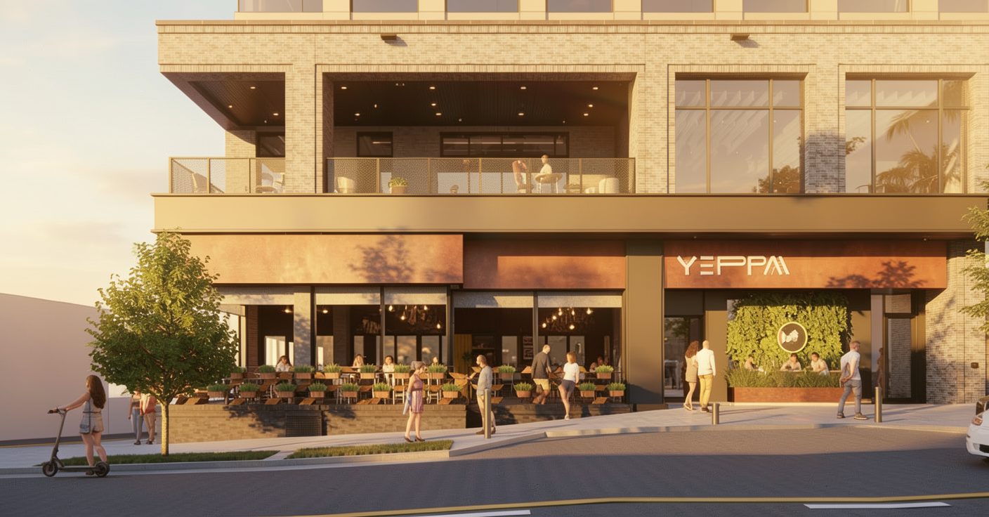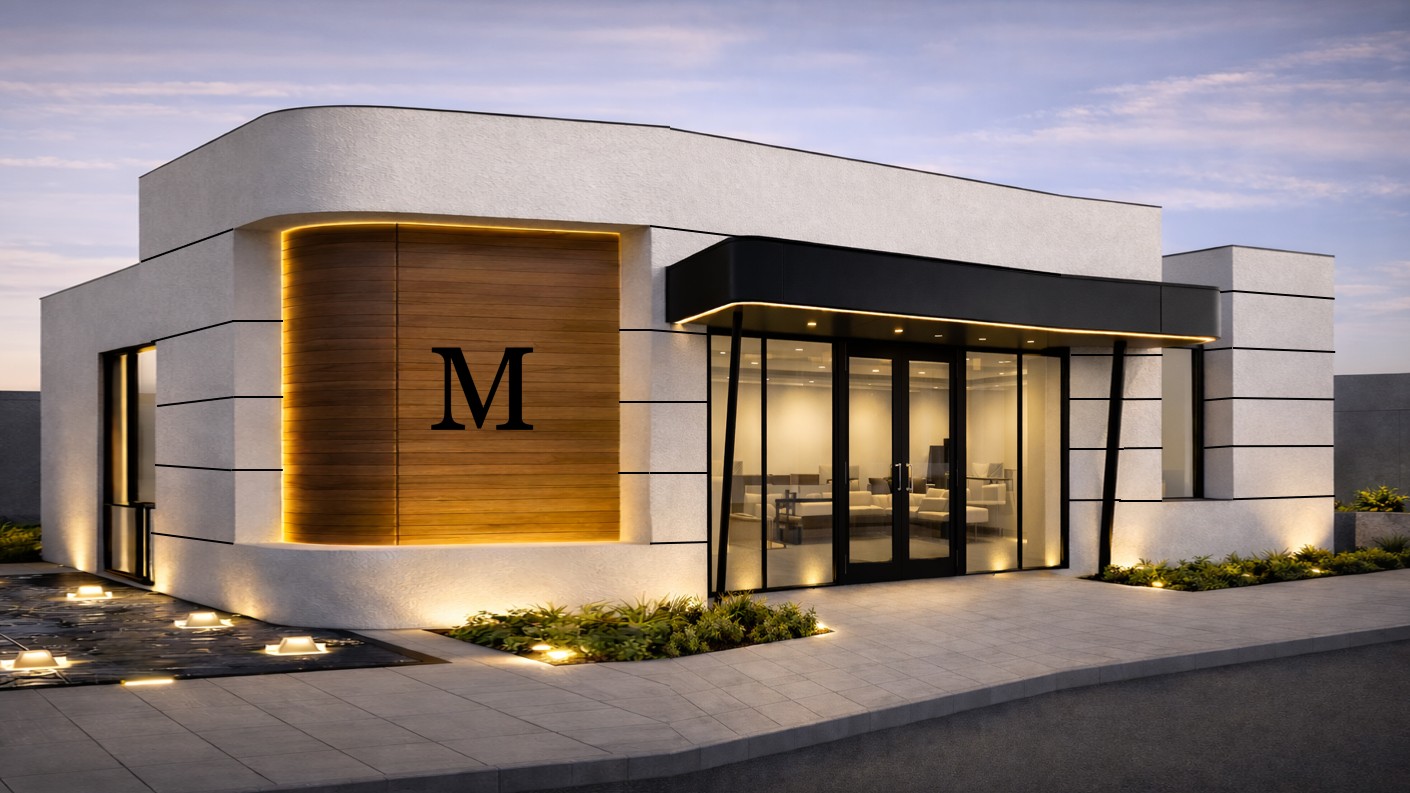 exterior shot design a contemporary luxury building with a different overall massing and footprint while maintaining the same material palette finishes lighting quality and upscale architectural character as the reference image use smooth light colored stucco or architectural plaster as the primary exterior finish combined with warm natural wood paneling used as a feature element integrate subtle horizontal reveal lines in the stucco to add depth and refinement incorporate black or dark bronze metal accents including sleek metal canopies trim elements and structural details use large format floor to ceiling glass with thin black aluminum frames to create a transparent elegant fa ade emphasize indirect architectural lighting warm led cove lighting concealed along roof edges soffits and recessed wall features to create a soft glow that highlights volumes without glare add low profile ground lighting and integrated landscape uplighting to enhance the building at dusk maintain a minimalist high end aesthetic with clean lines refined proportions and a calm balanced composition the overall look should feel modern exclusive and hospitality inspired suitable for a luxury residential commercial or amenity building scene should be rendered at golden hour or early evening to emphasize warm lighting premium materials and depth of shadows use high realism architectural photography style sharp details and accurate material textures