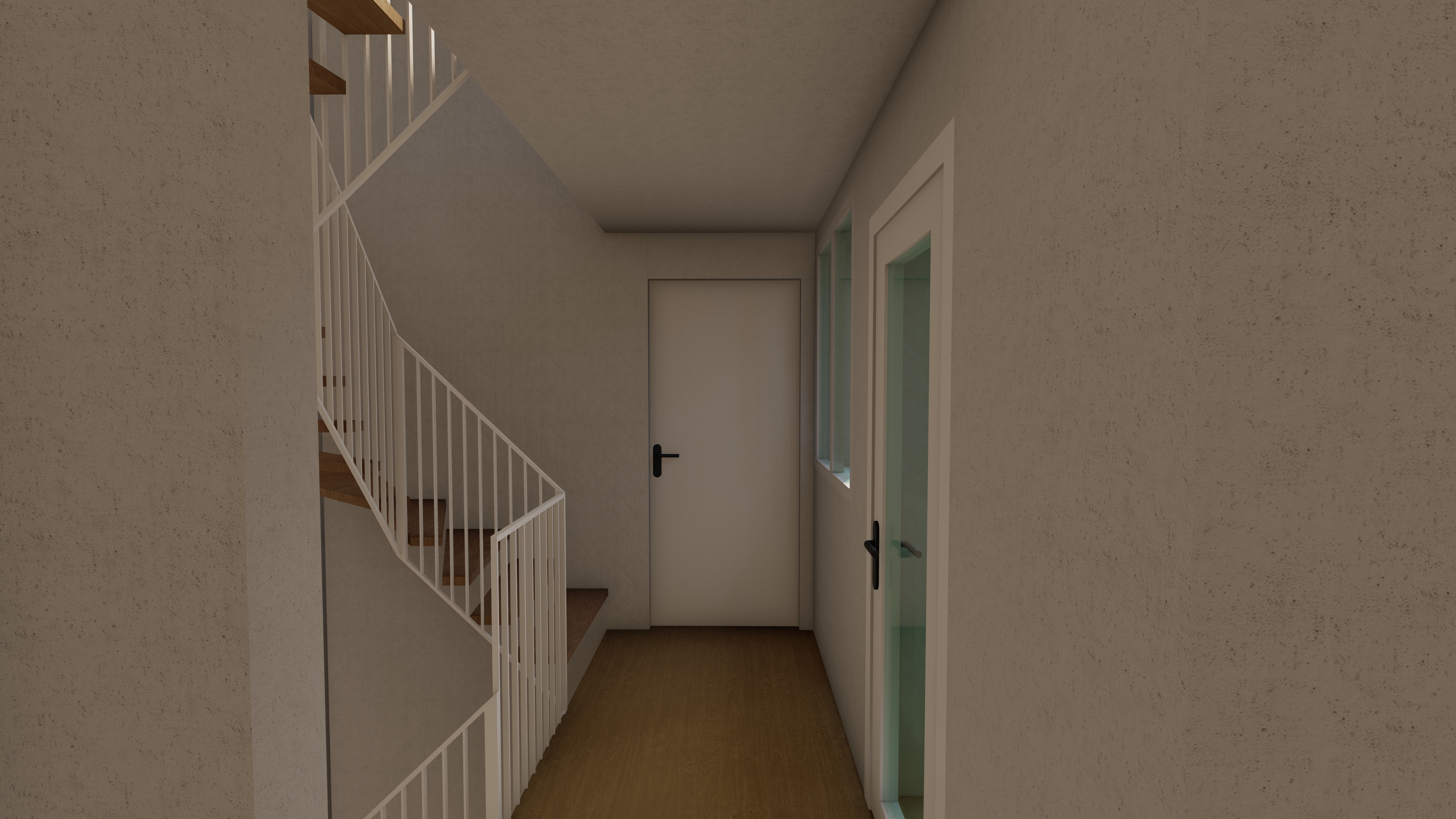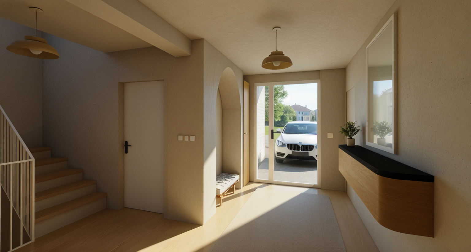 create a warm and bright atmosphere make sure the height of the window aligns perfectly with the top of both doors keep the dresser on the right unchanged and place a plant on top of it on the right the glass entrance door reveals a car facing forward in front of a white brick gate behind the gate a very close urban background is visible but it should appear softly blurred on the right side of the room the terrace should be visible enhancing the connection with the outside