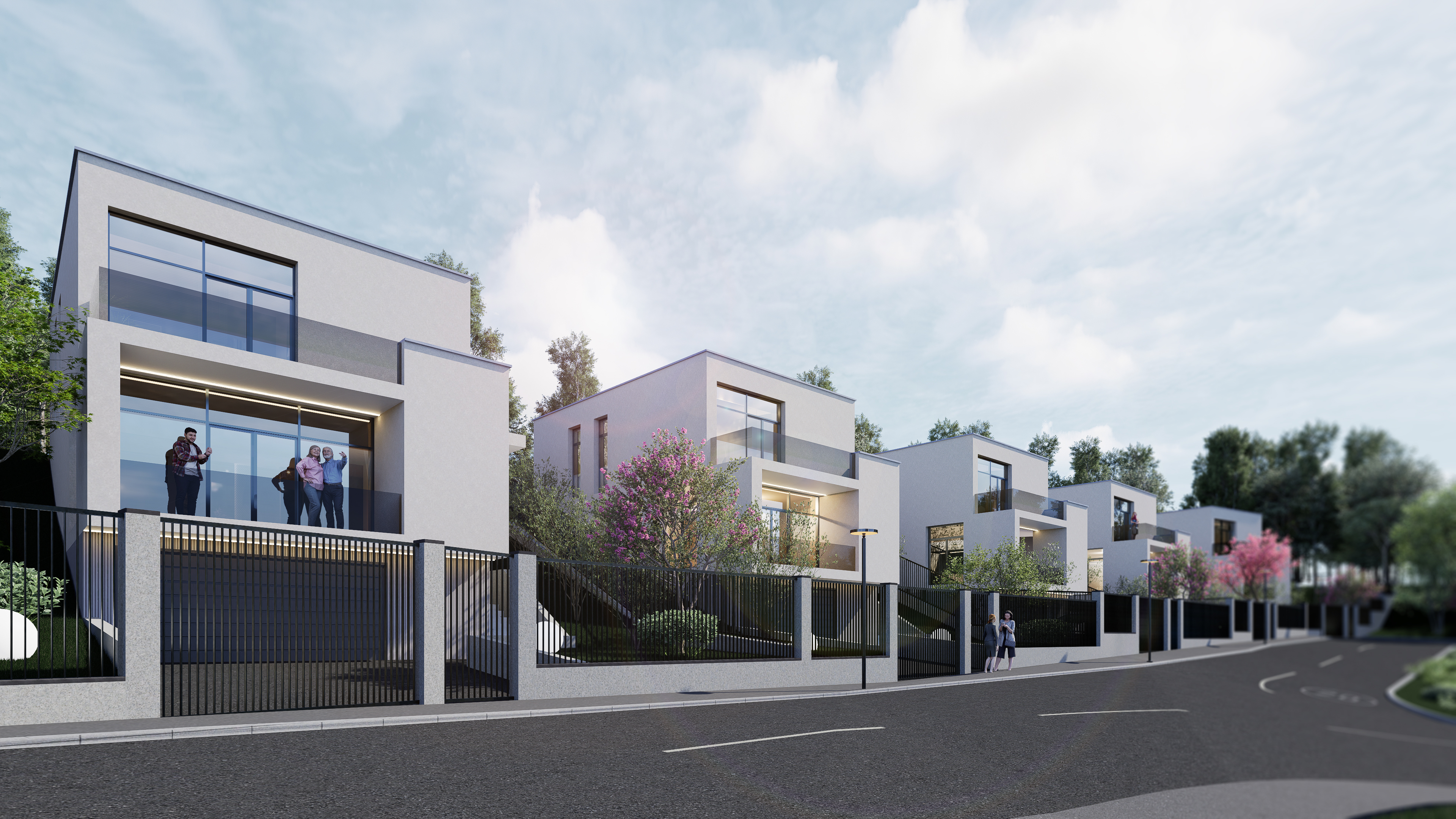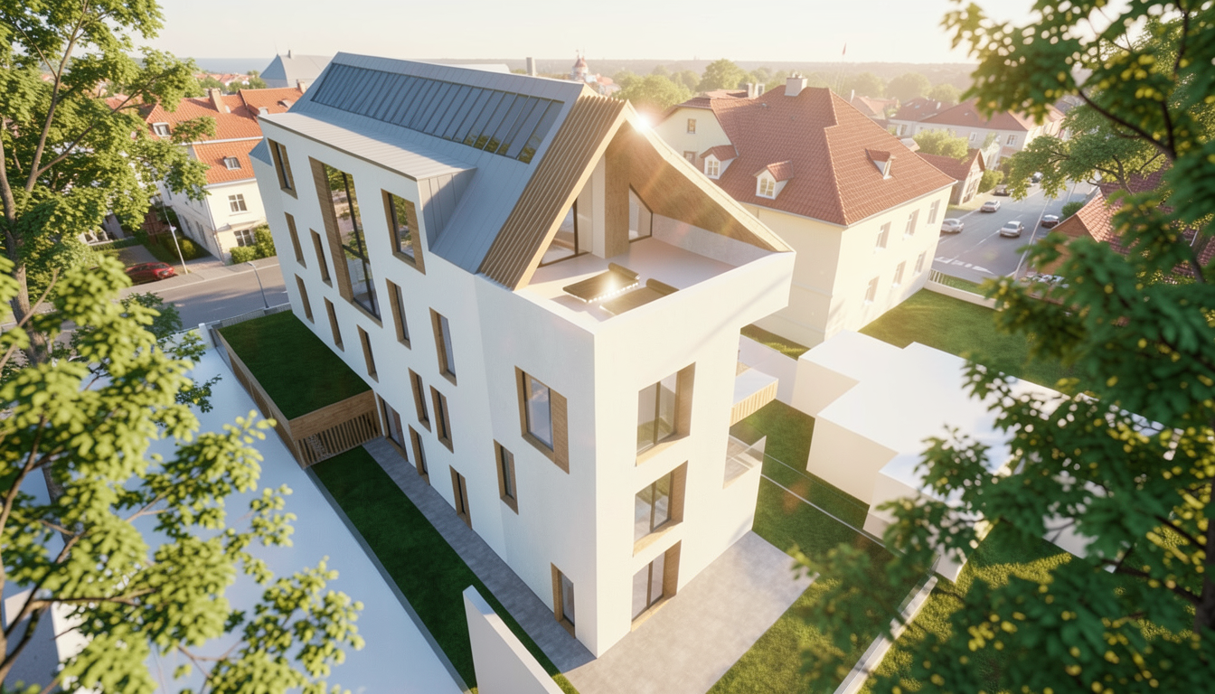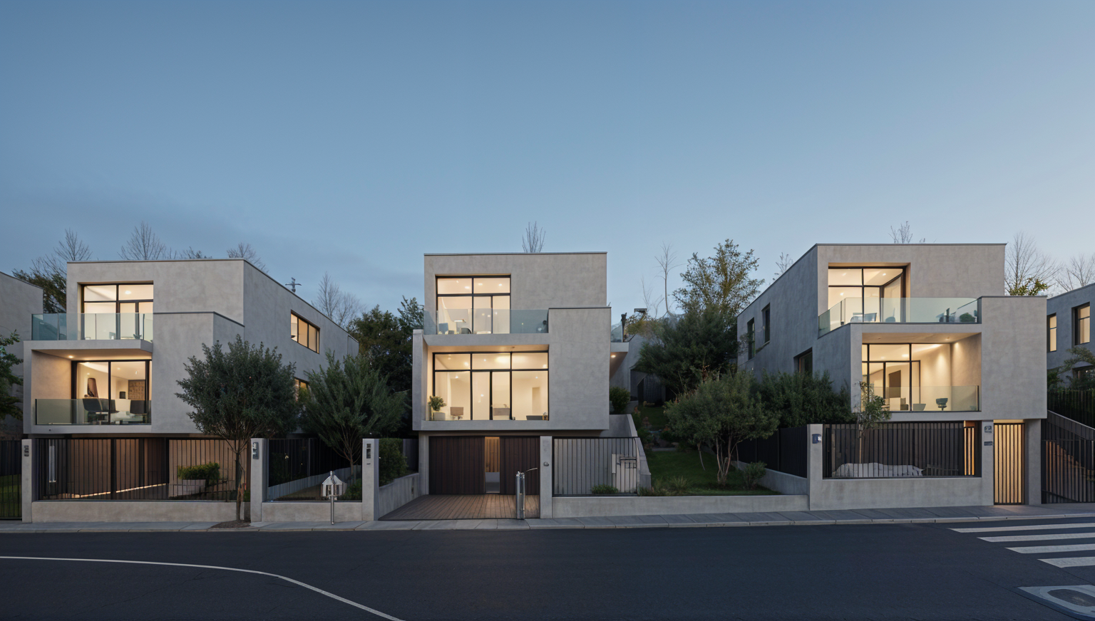 important do not modify geometry scale proportions buildings road layout sidewalks or surrounding context in any way keep the road markings facade materials light beige warm grey concrete and plaster subtle texture high material realism emphasize facade depth through existing balconies and window recesses using light and shadow only warm interior lighting visible through windows soft and natural neutral exterior lighting early evening blue hour atmosphere soft sky realistic light falloff photorealistic architectural rendering clean and balanced contrast calm cinematic mood style contemporary european residential architecture minimalist premium understated