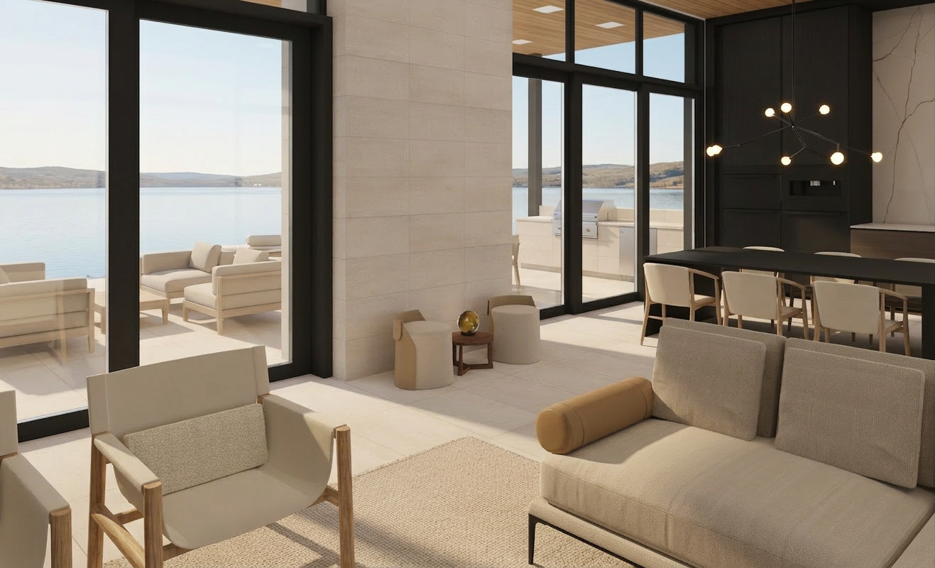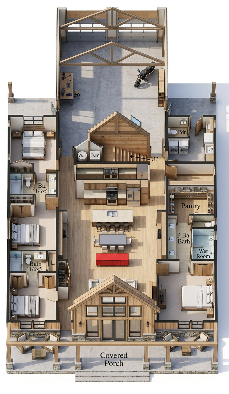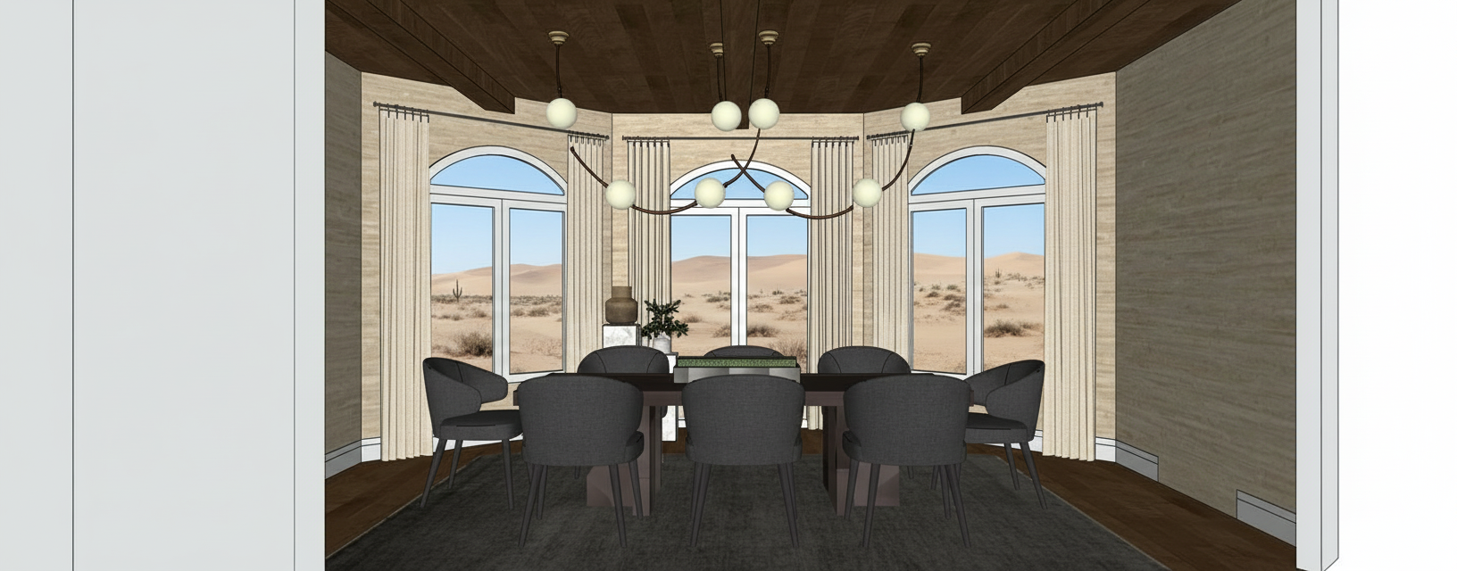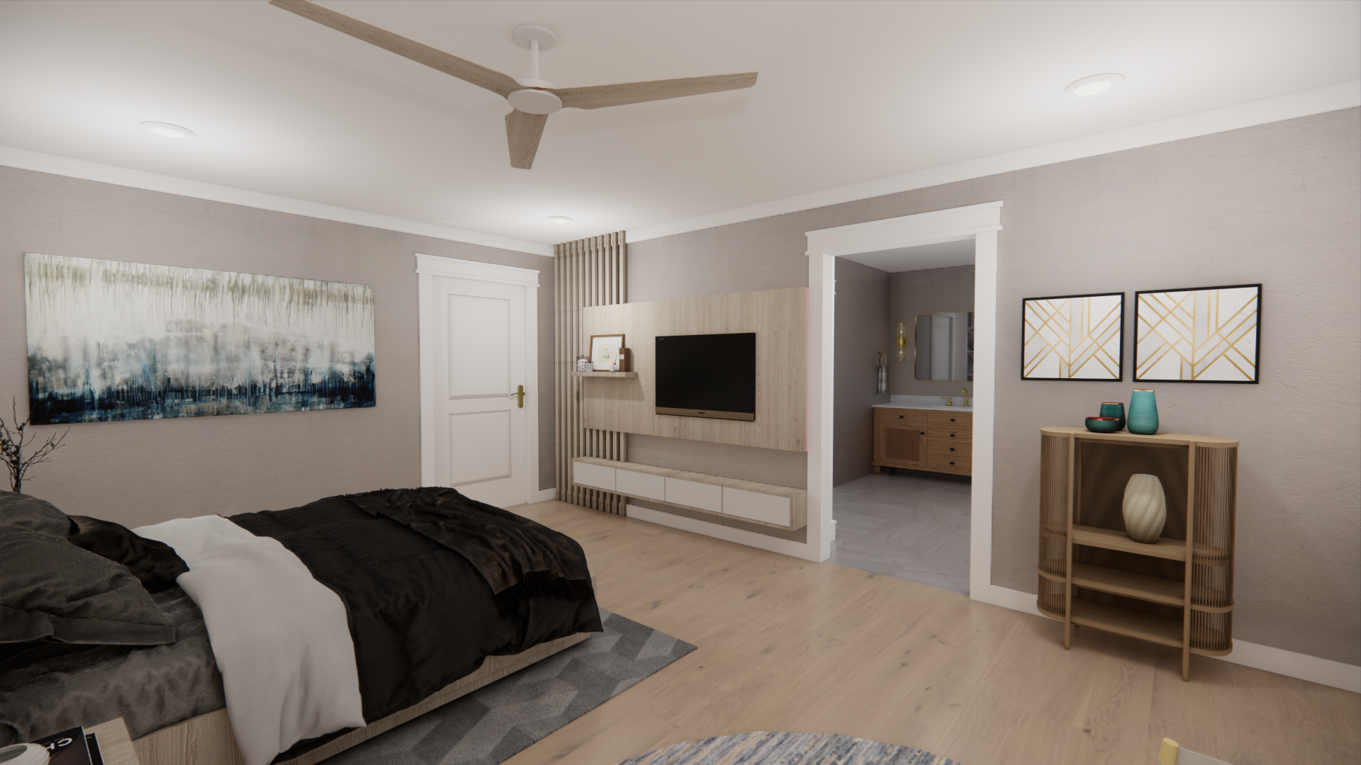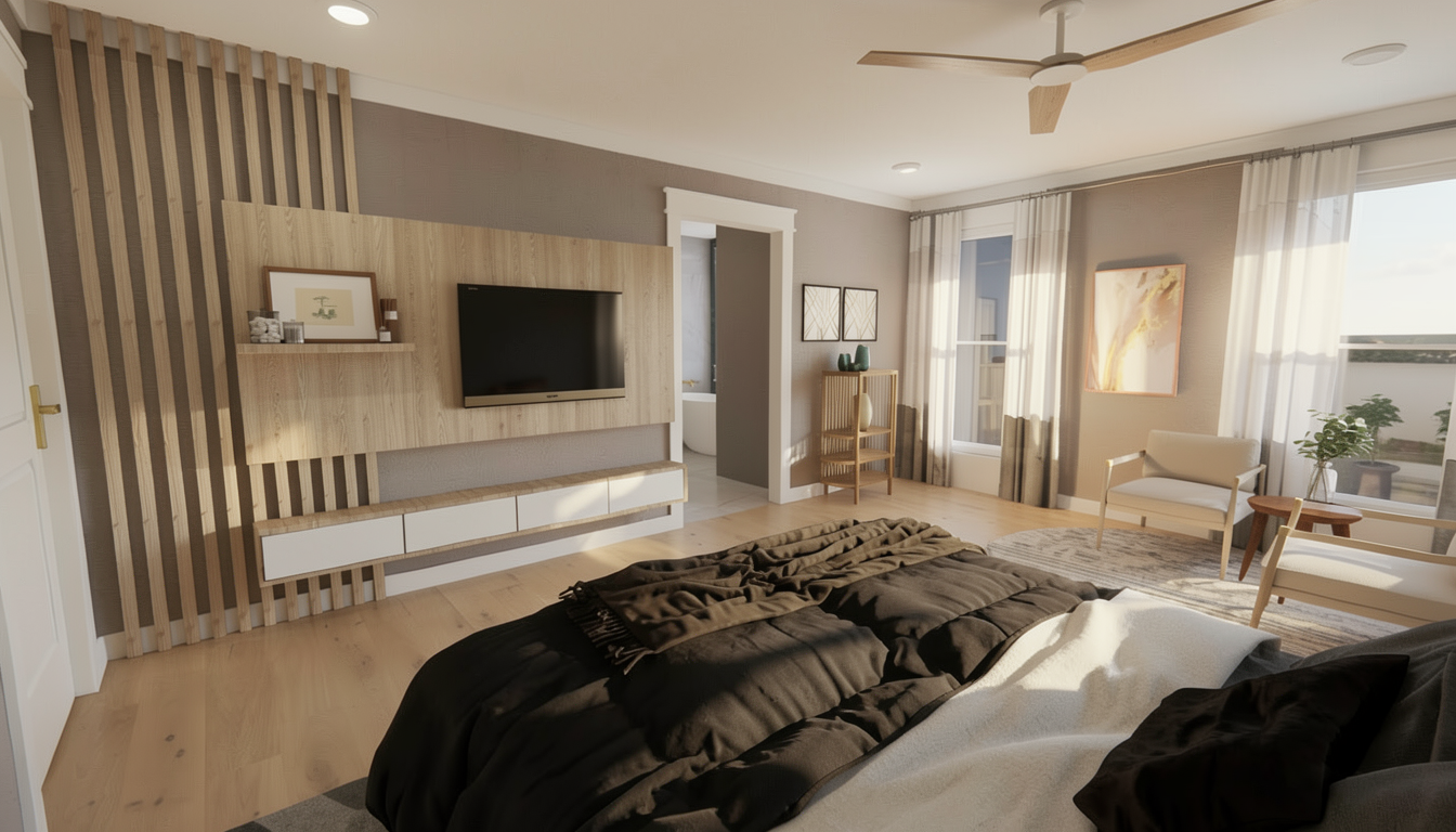 you are a professional image renderer you create the highest grade renderings around and specialize in architectural renderings this is master bedroom create a high resolution photorealistic image of this structure keep the windows as they are where they are keep the doors as they are where they are keep the main structure as it is where it is feel free to change the perspective do not add anything to the structure that i have not asked for the style is organic modern