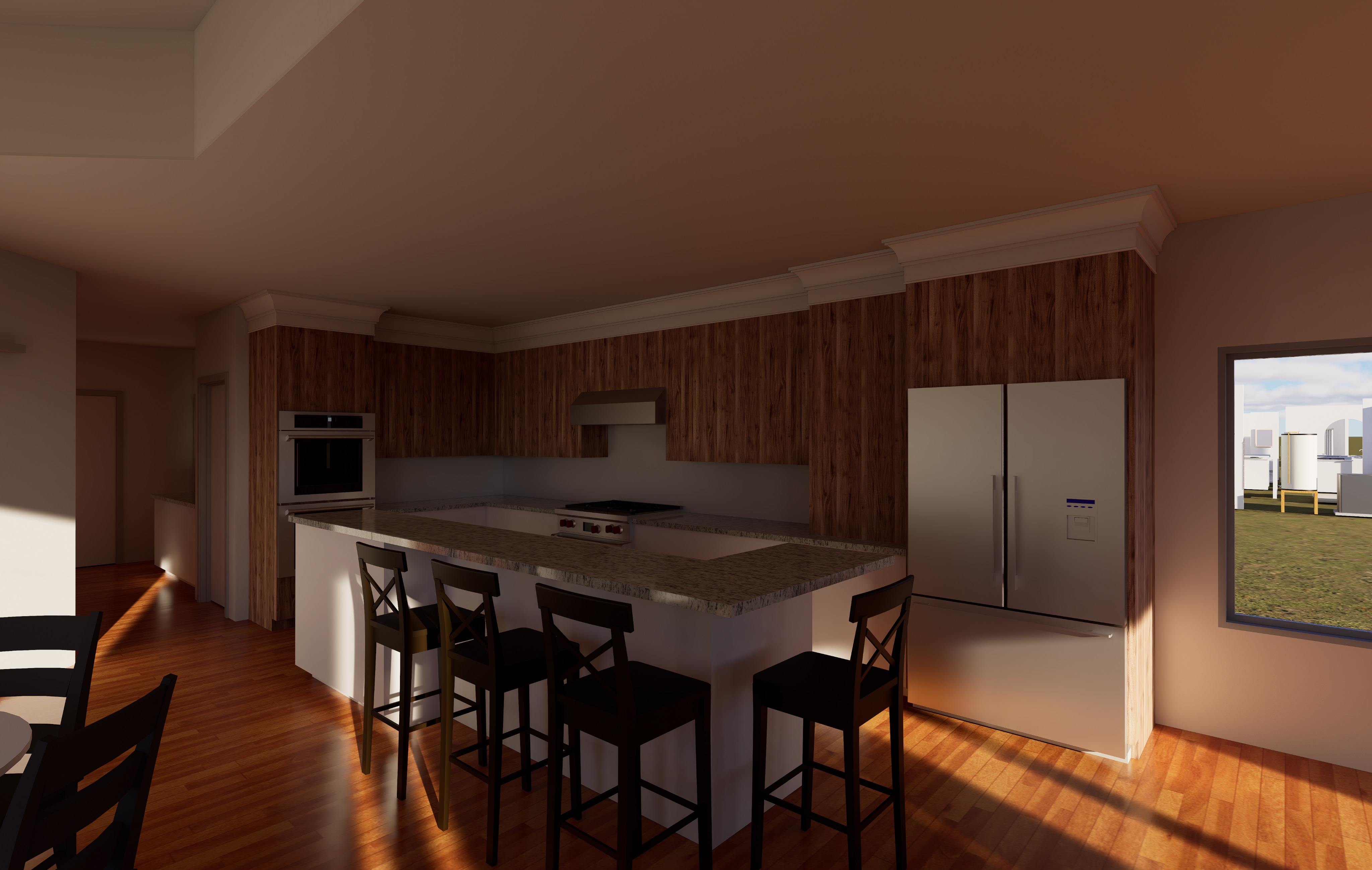 render this kitchen in a more modern transitional style add can lighting add 2 pendant lights over the kitchen island paint upper cabinets an off white color and natural wood for base cabinets