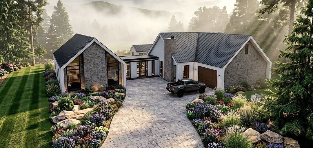 remove all gardens and landscaping and change to grass make the skies clear and remove fog change white siding to black vertical board and batten steel siding