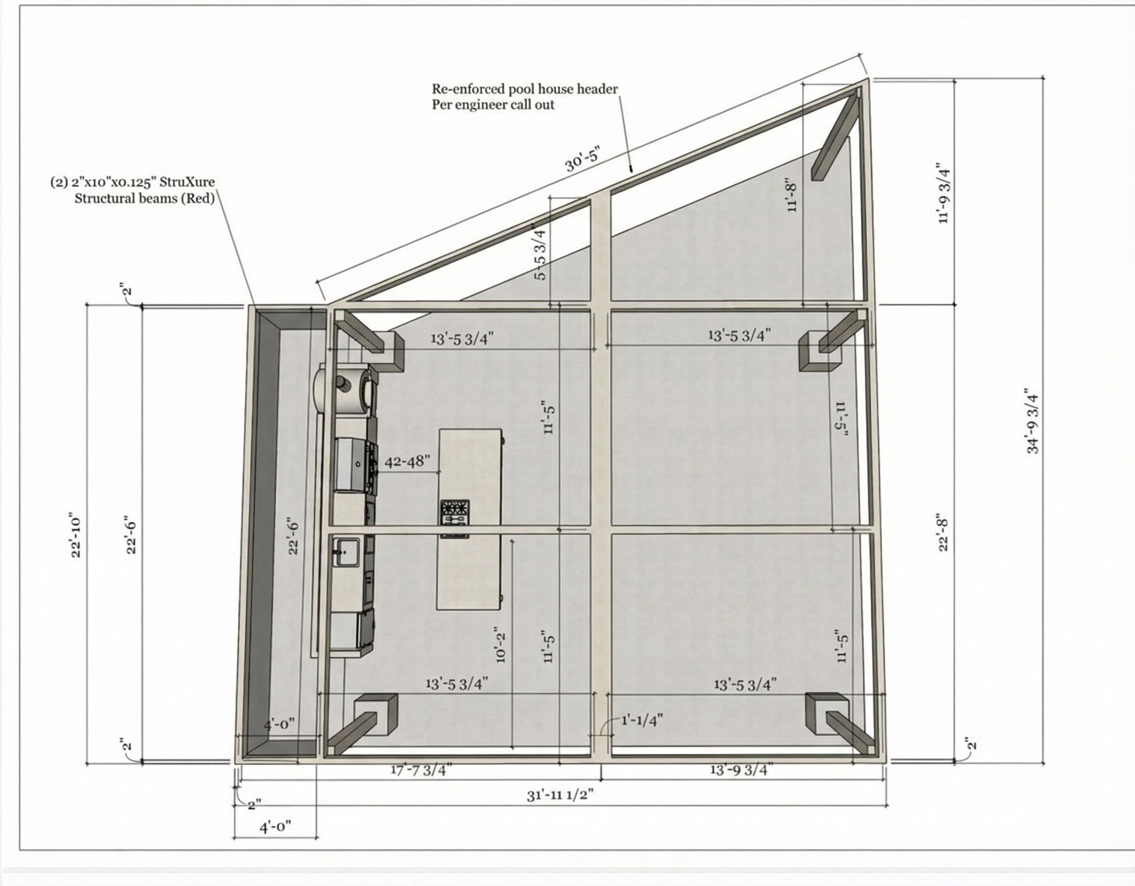 use the exact same top down camera angle pergola structure proportions and rendering style as the uploaded reference image maintain the full pergola footprint 32 ft wide x 22 ft deep with angled extension do not change scale lighting or materials use a clean architectural rendering style with soft shadows neutral concrete flooring and minimal detail inside the pergola create a freestanding l shaped kitchen not attached to the pool house left leg begins near front edge of pergola runs halfway down left side 10 12 ft front leg turns toward center runs 8 10 ft across include bar seating on the interior side of the l leave space behind the kitchen toward the pool house open option 3 l shape island strong entertaining option inside the pergola create a freestanding l shaped kitchen in same position as previous layout add a separate island 8 10 ft centered in pergola island parallel to front leg of l maintain 42 48 inches between all elements clear circulation on all sides