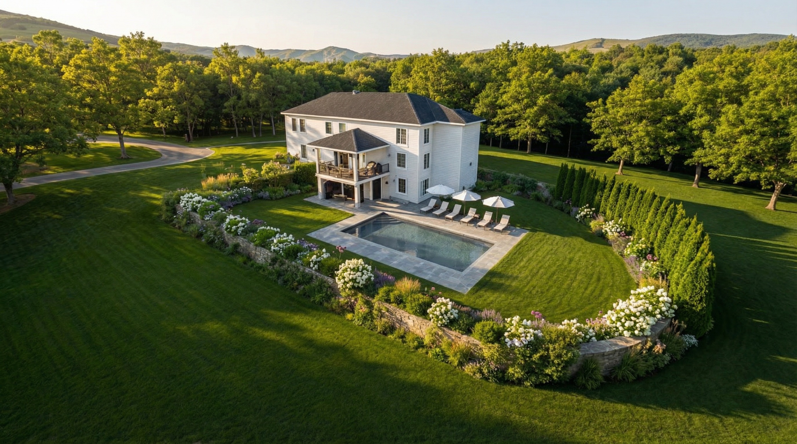 aerial view of a luxurious white house surrounded by lush green gardens golden sunlight casting long shadows on the manicured lawn a stone bordered swimming pool glistens under the clear blue sky white and vibrant floral accents line the perimeter alongside tall rich green trees rolling hills in the background provide a serene tranquil atmosphere enhancing the enchanting beauty of this idyllic setting render in hyper realistic detail with crisp clarity and vivid colors