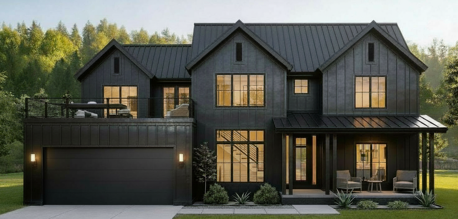 change the roof to black steel change the siding to a light brown vertical steel siding make the porch posts front door and garage door wood