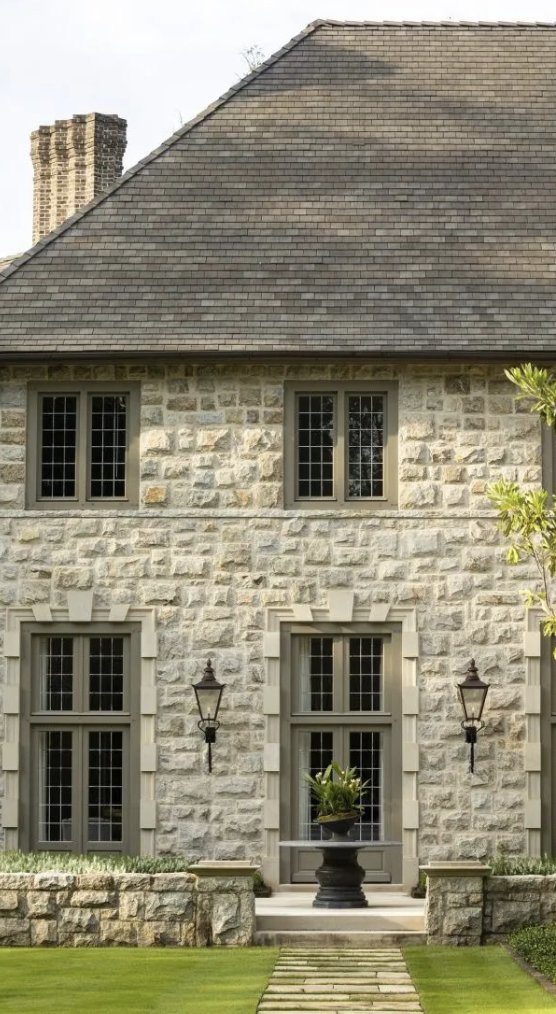exterior shot photorealistic rendering of a colonial revival home with stone walls and cream siding walls in a country setting keep all architectural details elements scale and placements keep all window sizes and styles shutters to be in benjamin moore copley grey front door is red oak texture add flared eaves on the roof and corbels under the roof add hydrangeas and white dogwood trees to the landscaping