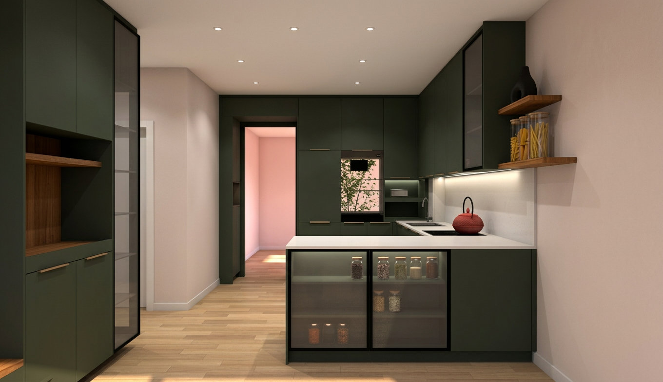 photorealistic architectural visualization of a modern single story brick bungalow house with a dark metal hip roof the house has warm light brown brick walls black rain gutters and downspouts dark window frames and a white entrance door with glass panels large rectangular windows with reflective glass the house sits on a concrete foundation with a paved stone driveway and walkway in front surroundings include a clean residential yard with green lawn a trimmed hedge fence along the property line and a leafy tree near the corner of the house suburban european neighborhood setting minimalistic landscaping neat garden edges and realistic ground textures golden hour lighting warm window lights cinematic sky landscaped garden with flowers and decorative shrubs ultra realistic materials high detail brick texture global illumination ray tracing professional architectural photography 35mm lens eye level camera angle 8k render